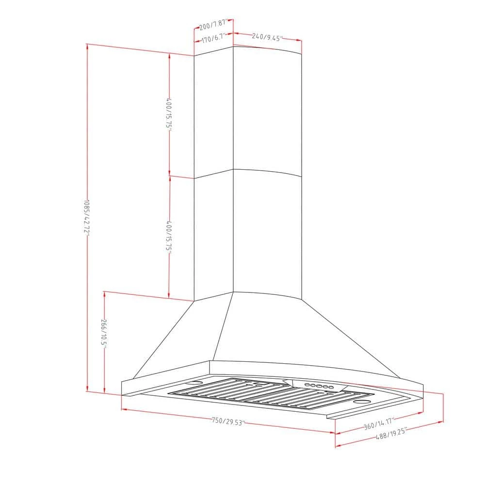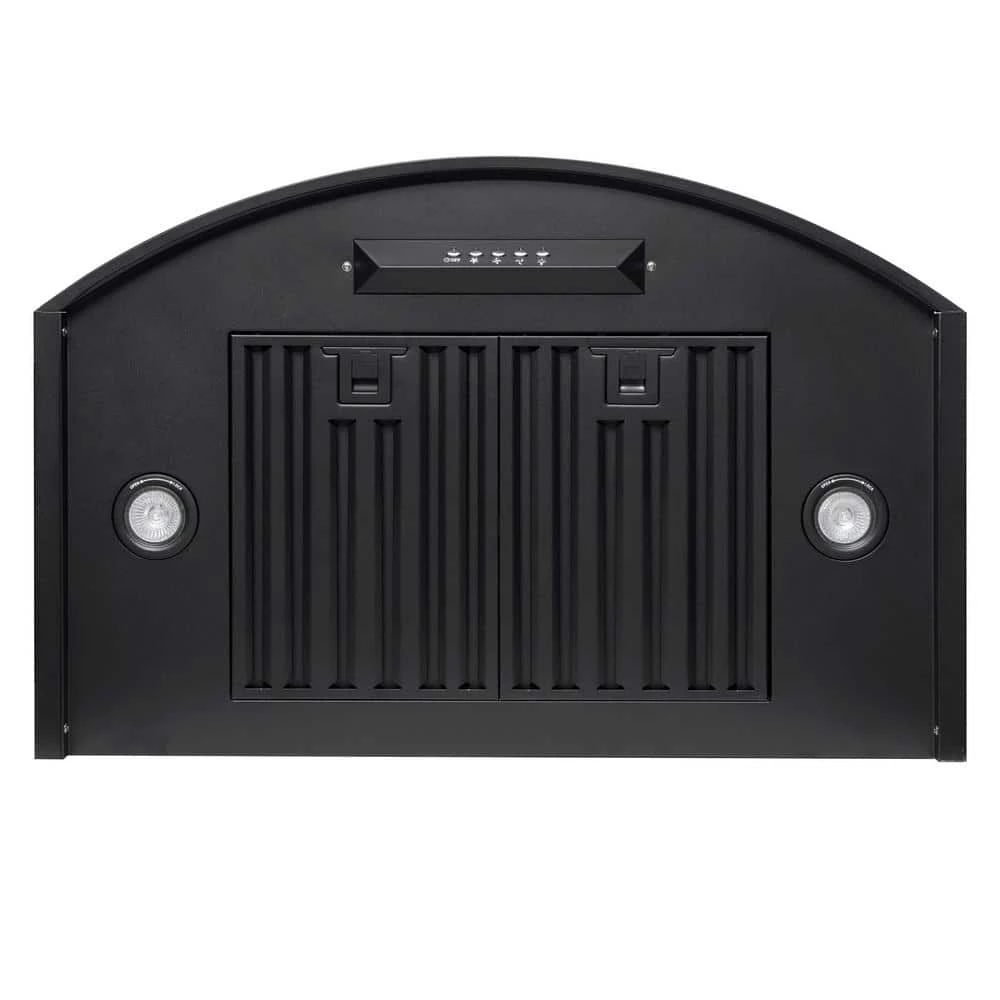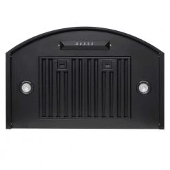 - Black painted wall mount range hood includes decorative chimney compatible with 8 ft. – 8.5 ft.