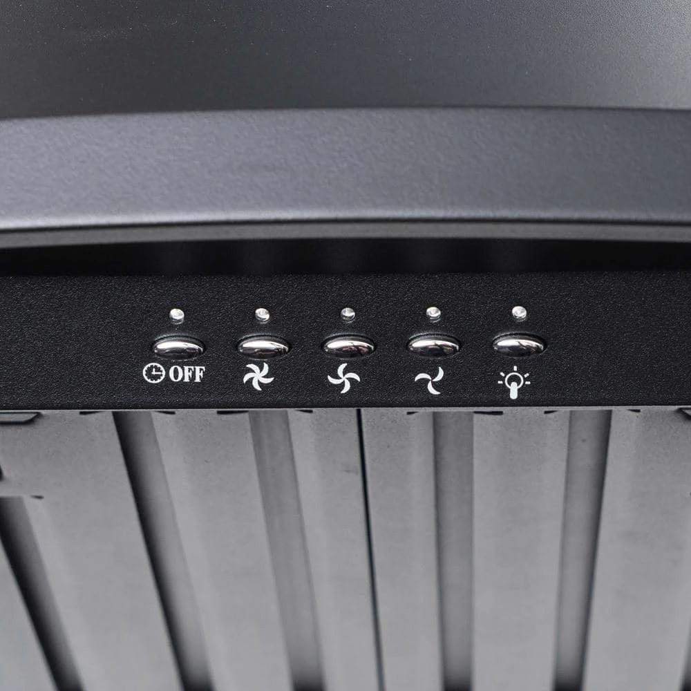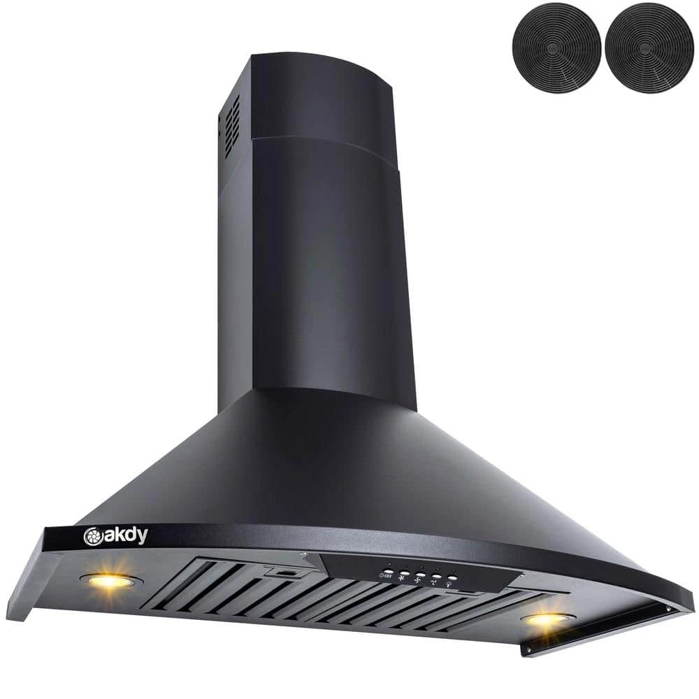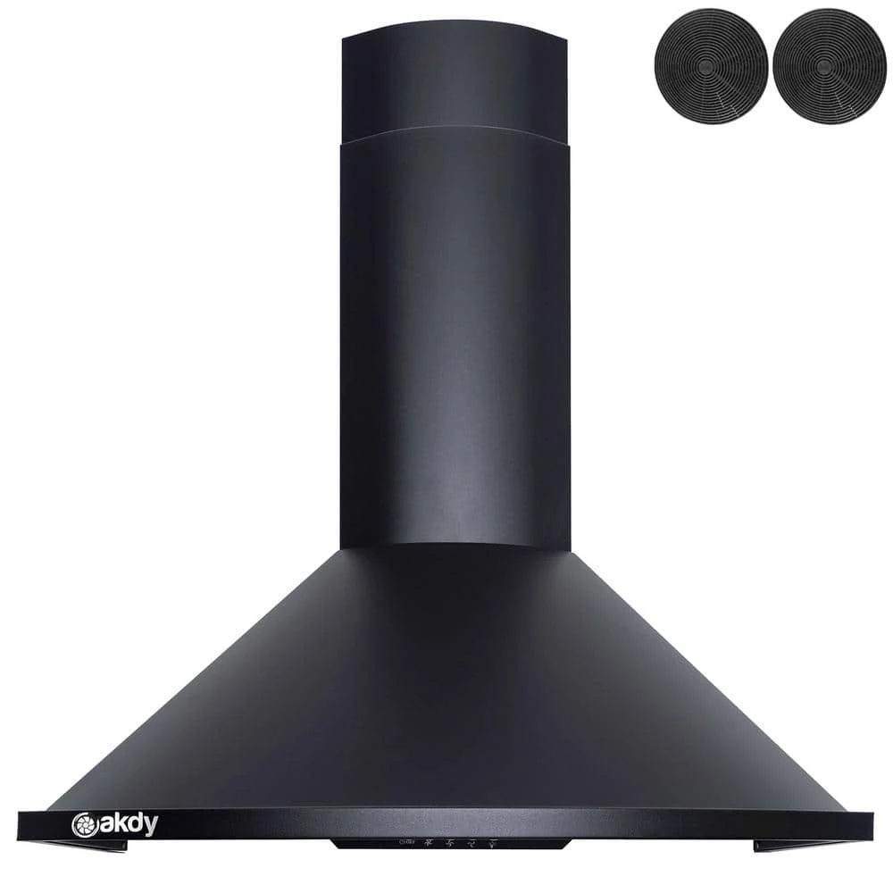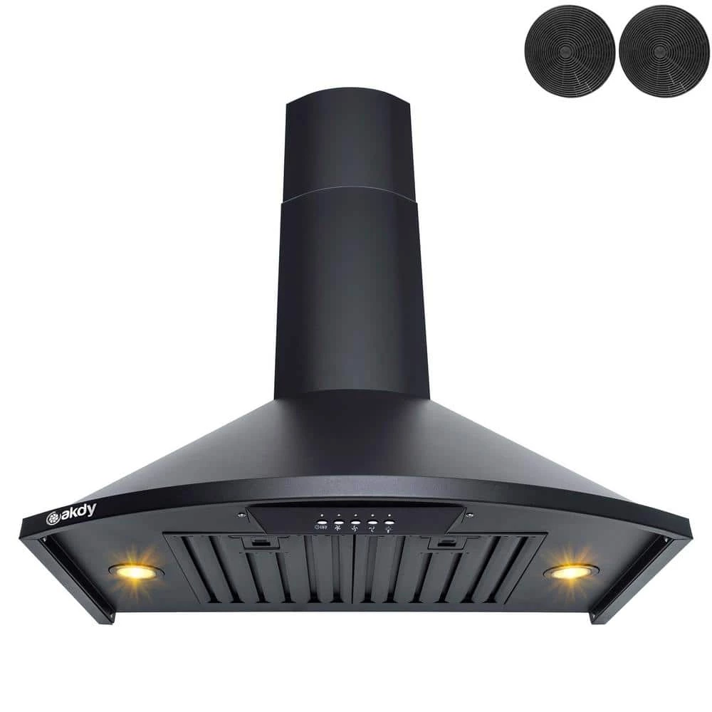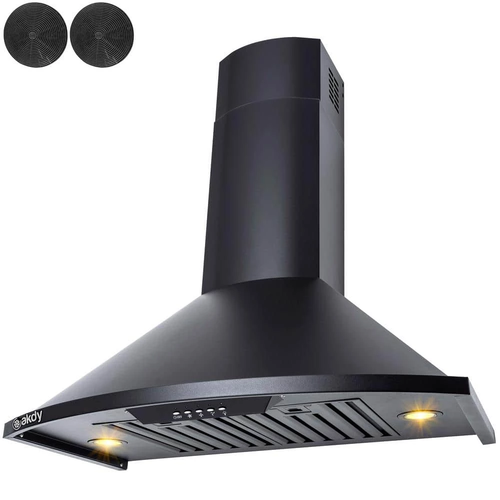 Futuristic, modern, and beautiful Black Painted. This AKDY 30 wall mount range hood brings a unique style that gives a contemporary feel to your kitchen. The control panel on the front brings a 3-speed, 343 CFM with a noise reduction of less than 65 dB Two 1.5-Watt LED lights that bright up the cooking area, and an 18 minute timer for when you need help keeping track of time. 2 baffle filters keep unwanted oil particles from leaving odors and keeping your kitchen fresh. They can be easily cleaned by dishwasher. For ductless recirculating installation, a carbon filter kit is available carbon filter kit is available (included: CF0015).