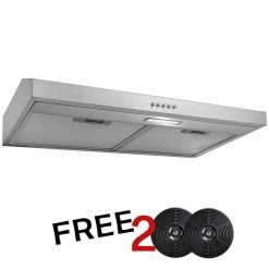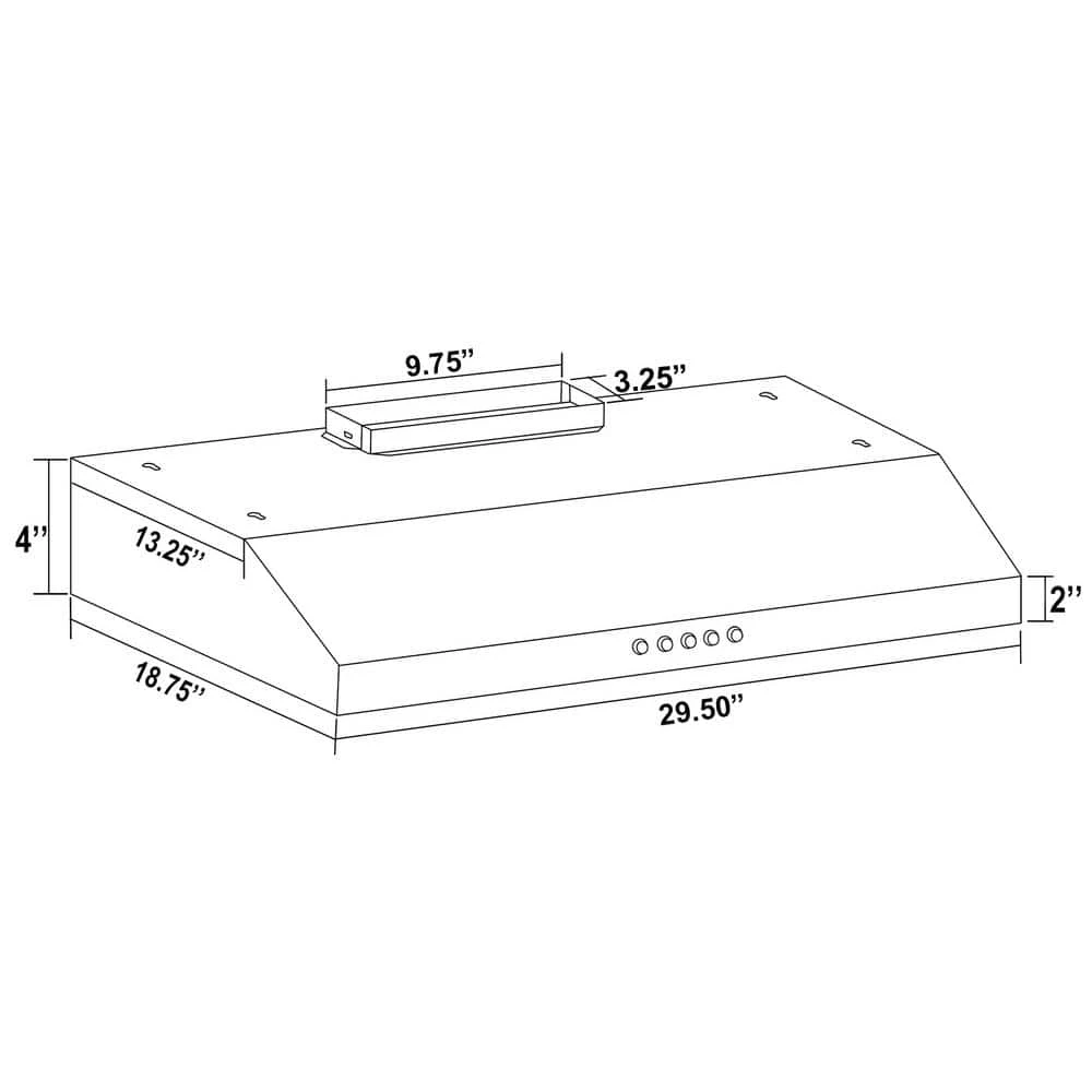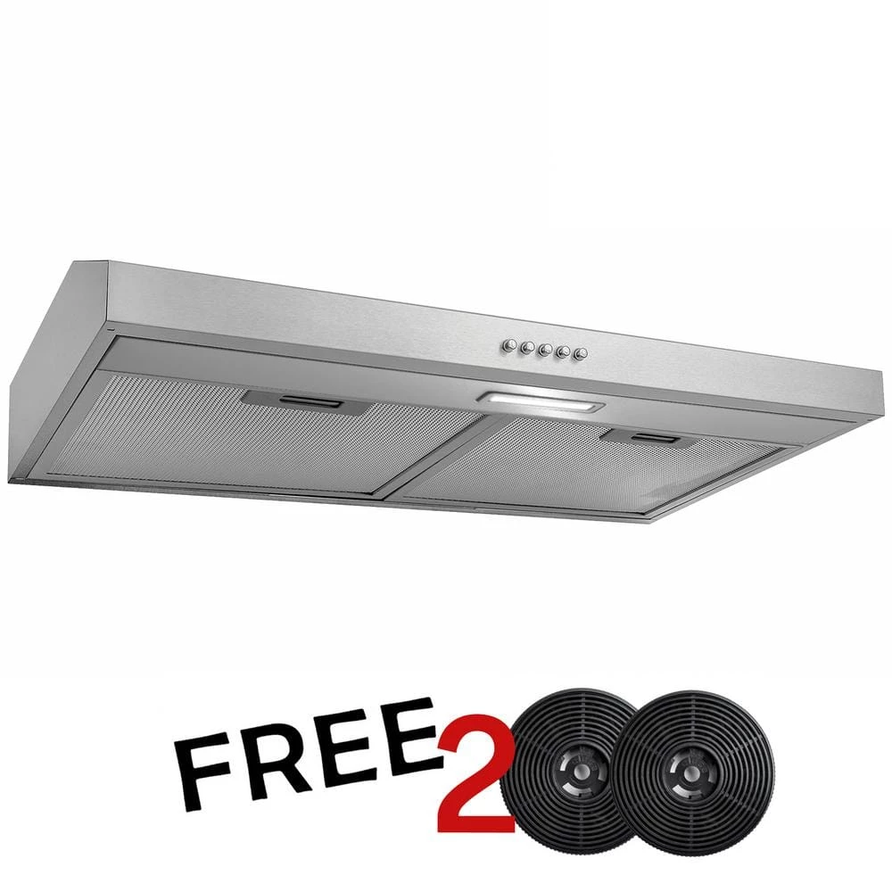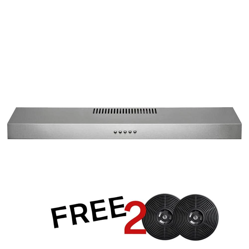 This sleek AKDY 30 in. under cabinet range hood is driven by style, featuring a brushed stainless-steel exterior. The buttons in the center of the range hood gives you three fan speeds which reach up to 58 CFM with minimal noise. The bar light gives your kitchen a lustrous bright light, for those late-night dinners with friends and family. At the bottom of the range hood are two aluminum mesh filters to keep unwanted oil particles from leaving odors and keeping your kitchen odor free. They can be easily cleaned through your dishwasher and put back with no hassle. Choose from two vent port options and a ventless option for ductless recirculating installation based to your kitchen needs. This range hood comes with a motor wattage of 85-Watt and an airflow efficiency of 0.68. The power cord is not included with this range hood. 2-carbon filter kit is included (CF0016).