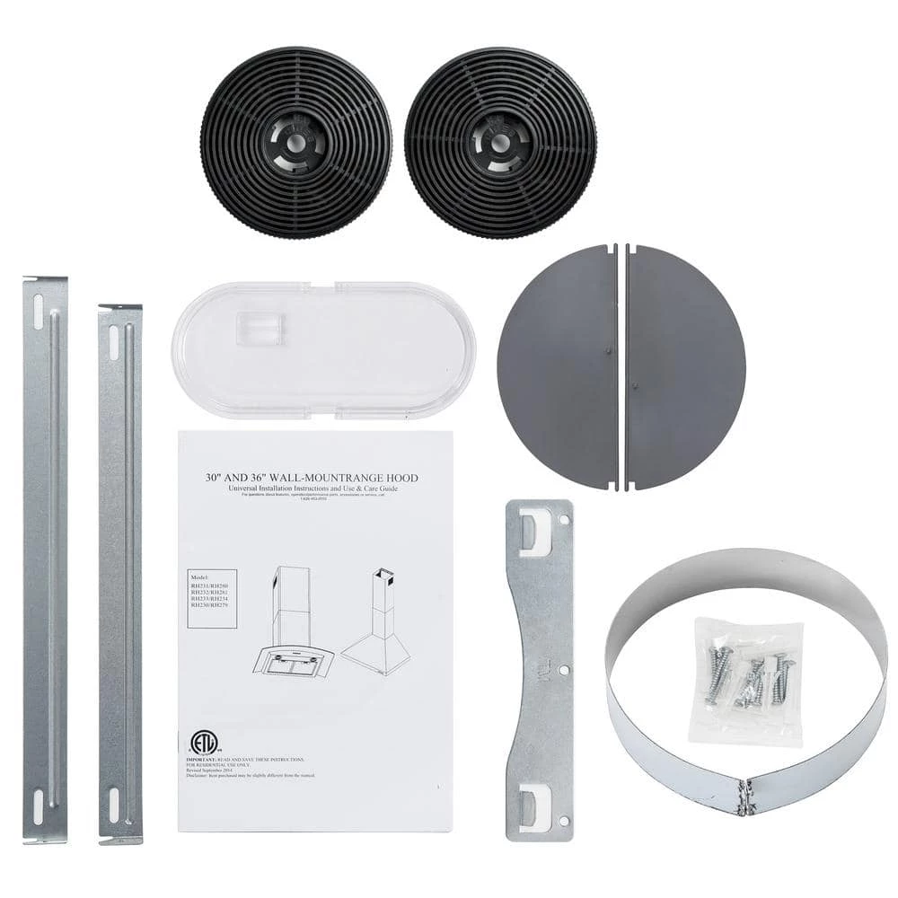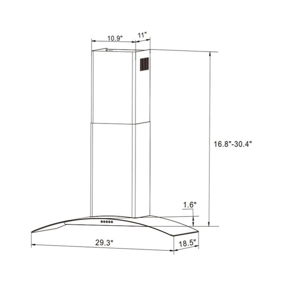 - Wall mount range hood includes tempered glass and decorative chimney compatible with 8 ft. to 8.5 ft. ceilings