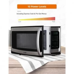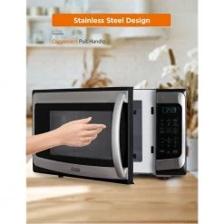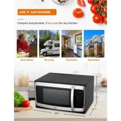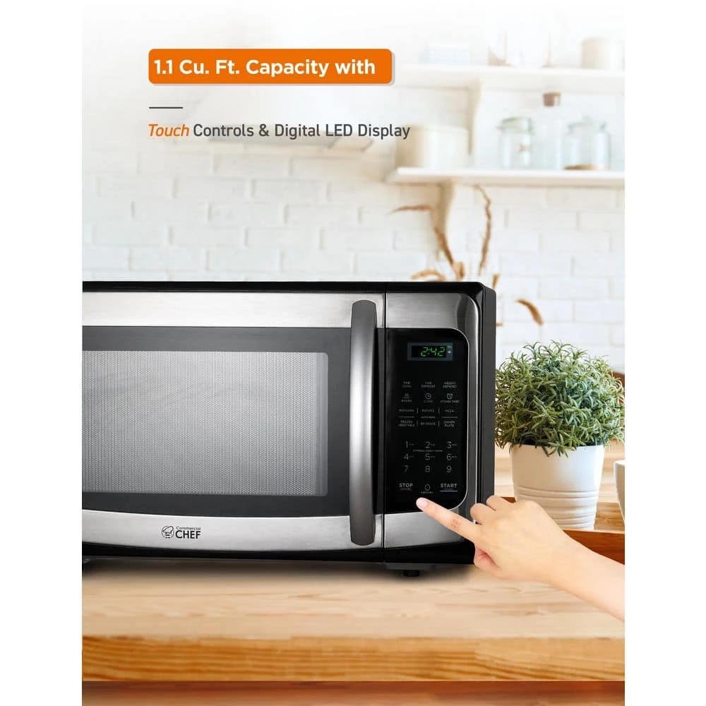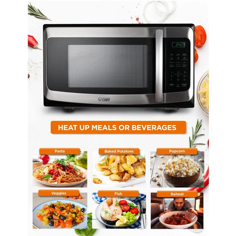 Heat and re-heat your favorite foods and beverages with this outstanding COMMERCIAL CHEF microwave oven countertop. With an impressive capacity of 1.1 cu. ft., this 1000-Watt microwave oven ensures you can grab and go with delicious meals. Our fantastic microwave stainless steel (20.2 in. x 15.7 in. x 12.1 in.) will fit easily on kitchen countertops in homes, apartments, RVs, dorms, and more. Weighing only 32 lbs., you can transport this stainless steel microwave countertop anywhere so heated food and drink is within reach. This small microwave oven has impressive power levels such as Time Cook, Time Defrost, Weight Defrost, and Power. Preset Menu Options include Popcorn, Potato, Pizza, Frozen Vegetable, Beverage, & Dinner Plate. Also included on the digital display is Clock and Kitchen Timer. Our small countertop microwave and microwave 1.1 cu ft will heat from as little as 30 seconds to as long as you desire! When it comes to microwave ovens 1000-Watt, our additional features are superior, including a stylish stainless steel pull handle, an efficient turntable that guarantees even heating, child safety lock, yellow & green LED lighting, and sleek black housing. What’s not to love about this COMMERCIAL CHEF microwave 1000-Watt countertop. Its reliable heating ability, impressive functions & settings will have you heating and re-heating throughout your busy day.