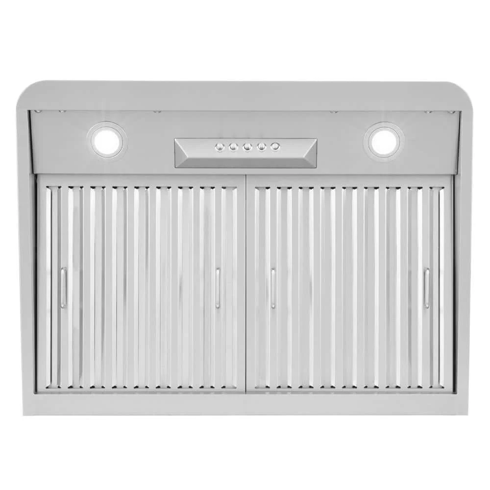 - 30 inch under cabinet range hood has sleek stainless steel push button controls operate the fan and lights and integrate seamlessly with the range hood design