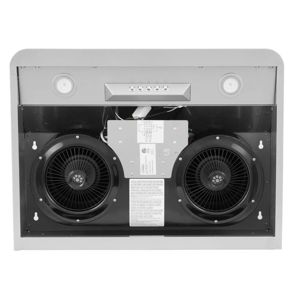 Cosmo presents a modern professional under cabinet range hood that adds bold, distinct flair to your kitchen. This 30 inch range hood fits easily underneath an existing cabinet, and has a premium brushed stainless steel body that matches seamlessly with existing kitchen appliances for a modern upscale look. Our under cabinet range hood vents from the top and features high efficiency motors to move 500 CFM of air through our premium Cosmo ARC-FLOW permanent filters to trap grease, oil and odors. Our permanent stainless steel filters save you money on replacements year after year, and are dishwasher safe for added convenience. Our newly designed under cabinet range hood is both energy efficient and quiet, utilizing high lumen LED lighting for year round cost savings. A 3-prong, 120V power cord is included for easy installation. Under cabinet range hood comes configured for ducted use, range hood can be converted to ductless/recirculating with purchase of carbon filter kit (part # CFK5-JL). Trust Cosmo for your next kitchen appliance for premium quality at factory-direct prices.