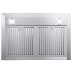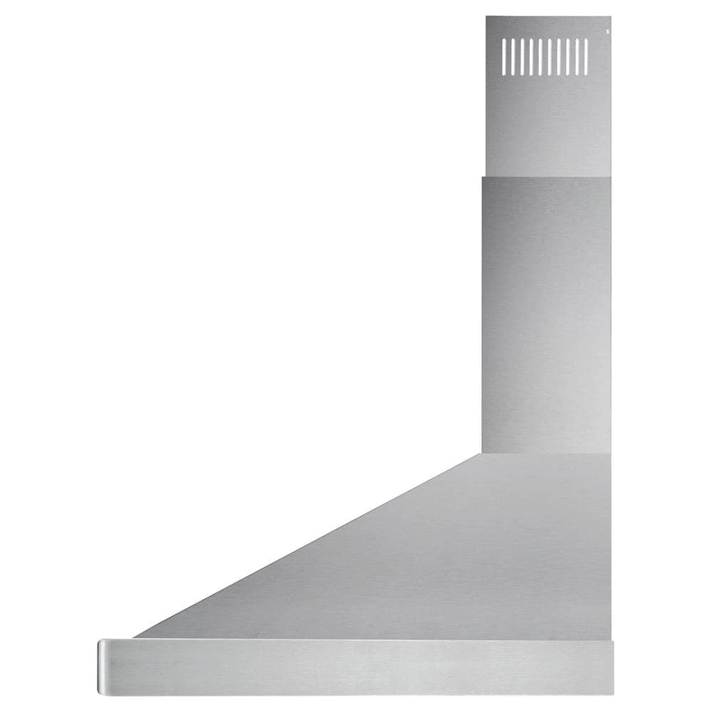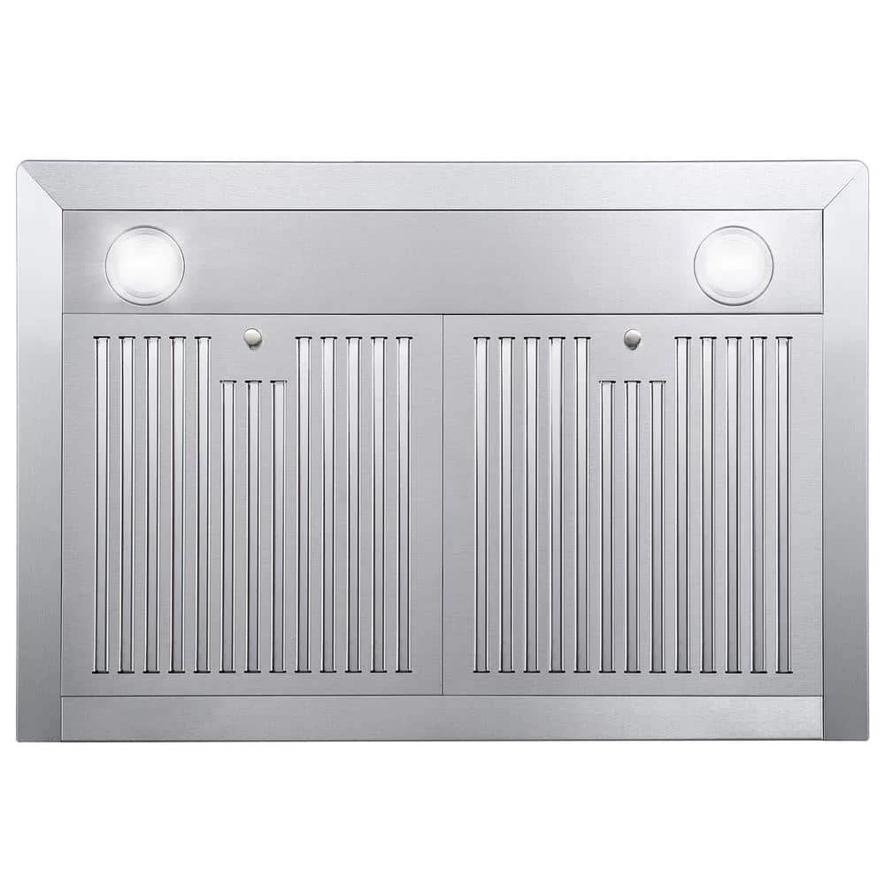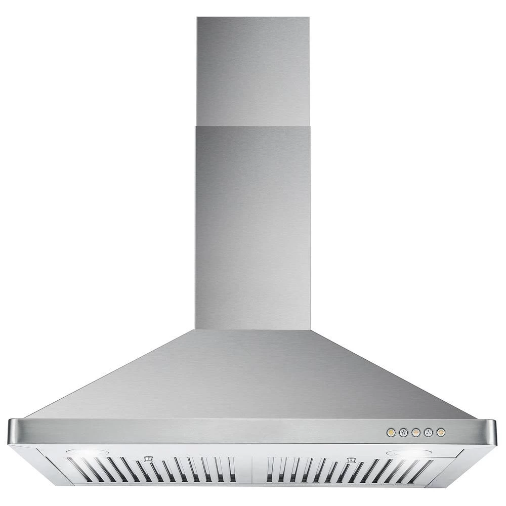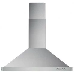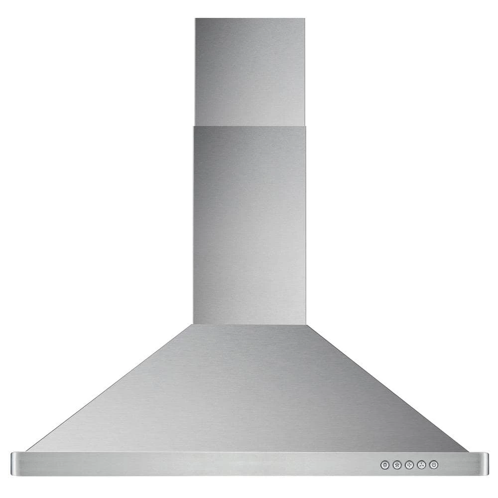 - 30 inch wall mount range hood has push button controls operate the fan and lights in sleek stainless steel that integrates seamlessly with the wall mount range hood design