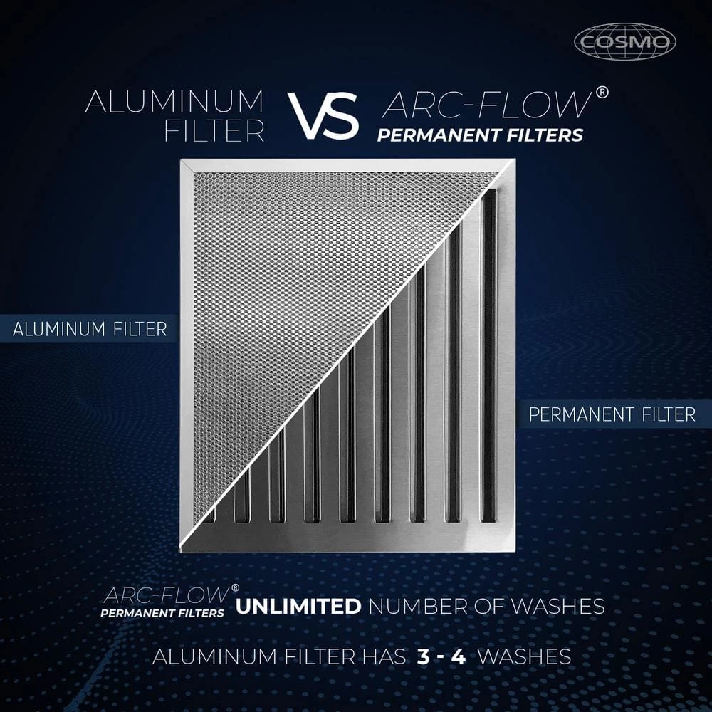 - Cosmo ARC flow permanent filters are constructed of high quality stainless steel to effectively capture grease and cooking odors and keep the air clean, our ARC flow permanent filters are dishwasher-safe and extremely durable, no need to replace these filters, simply drop them in the dishwasher for easy maintenance