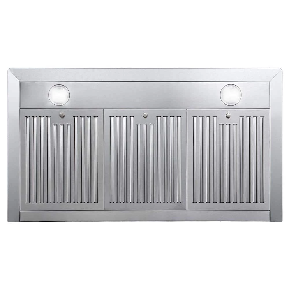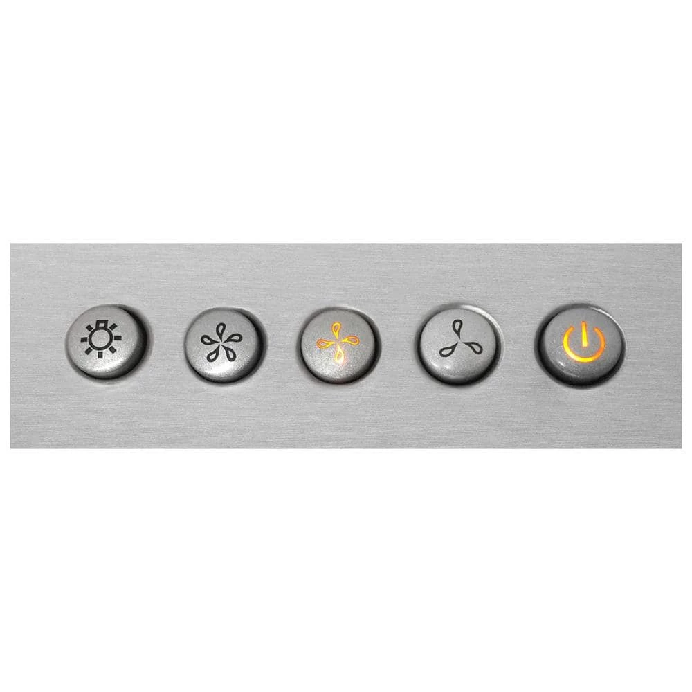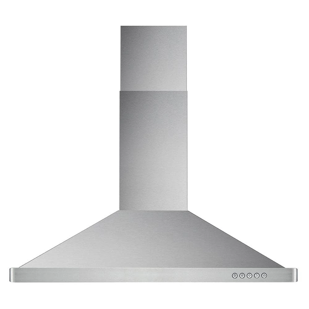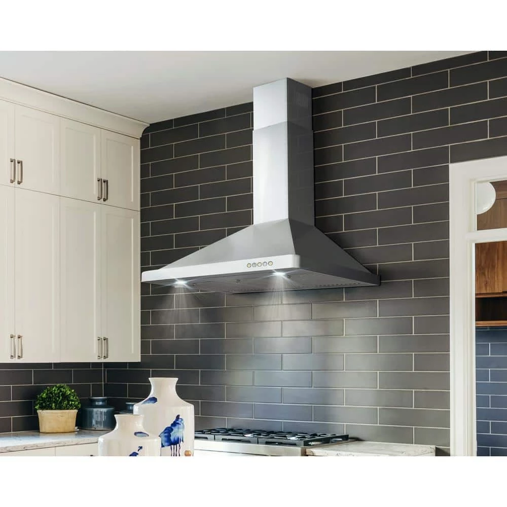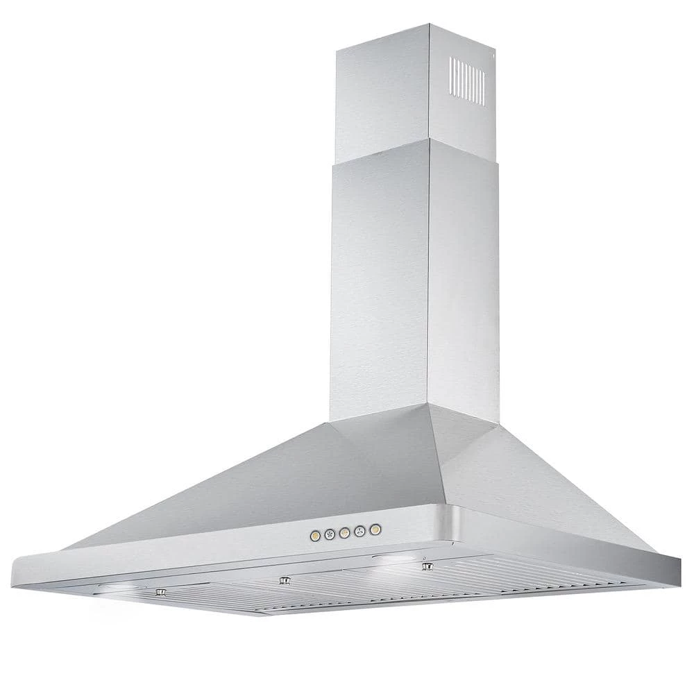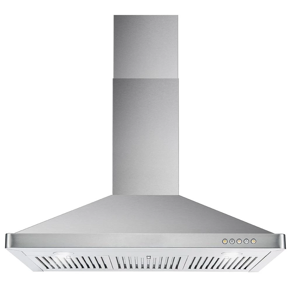 - 36 inch wall mount range hood has push button controls operate the fan and lights in sleek stainless steel that integrates seamlessly with the wall mount range hood design
