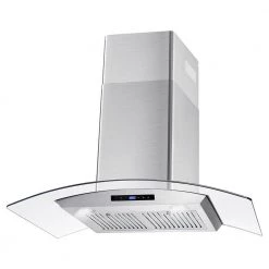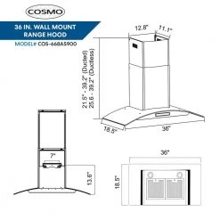 Elevate your kitchen decor to new heights. Cosmo’s COS-668AS900 wall mount range hood kitchen hood features a stainless steel body with a tempered glass visor. Heavy duty stainless steel permanent filters are dishwasher safe for easy clean-up. 380 cu. ft. per minute suction traps smoke and fumes from disturbing your home. This wall mount range hoods glass visor also captures smoke and steam, ensuring it doesn’t escape into your home. LED lighting is available for added visibility. Touch controls make using our wall mount range hood easy.