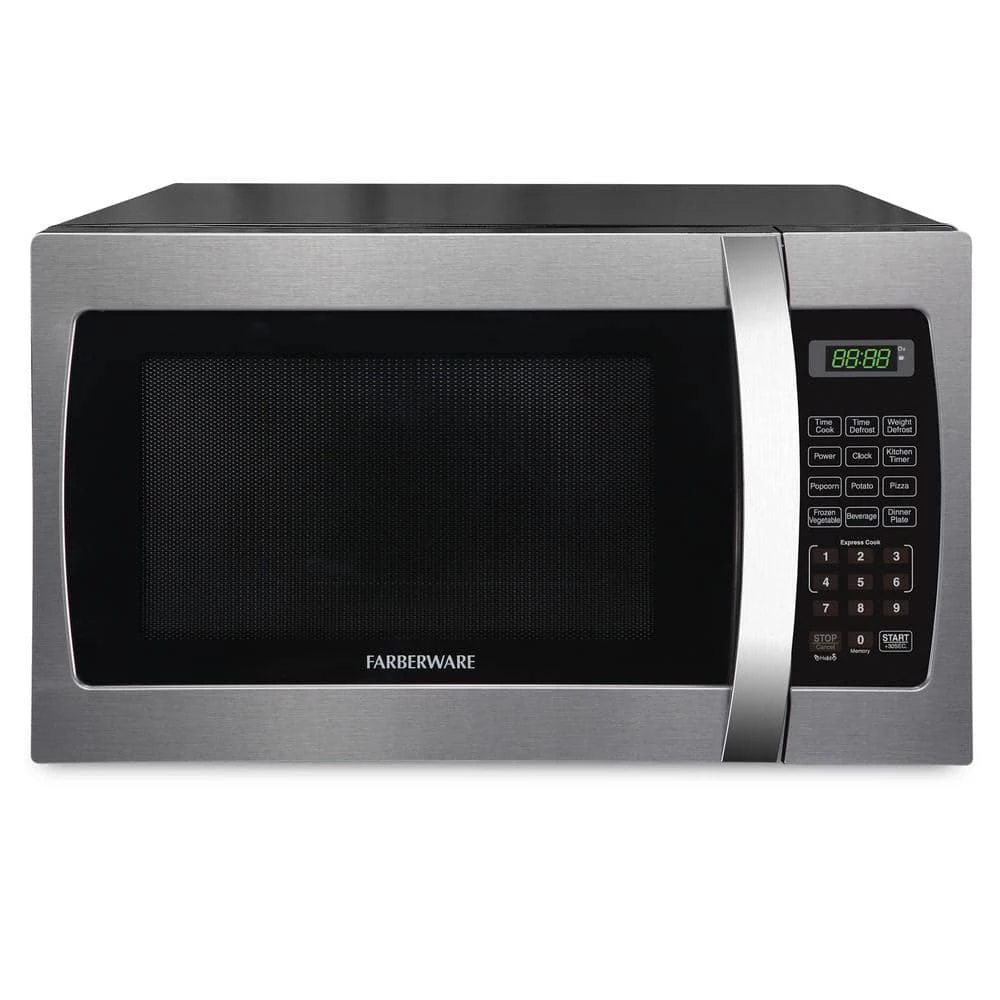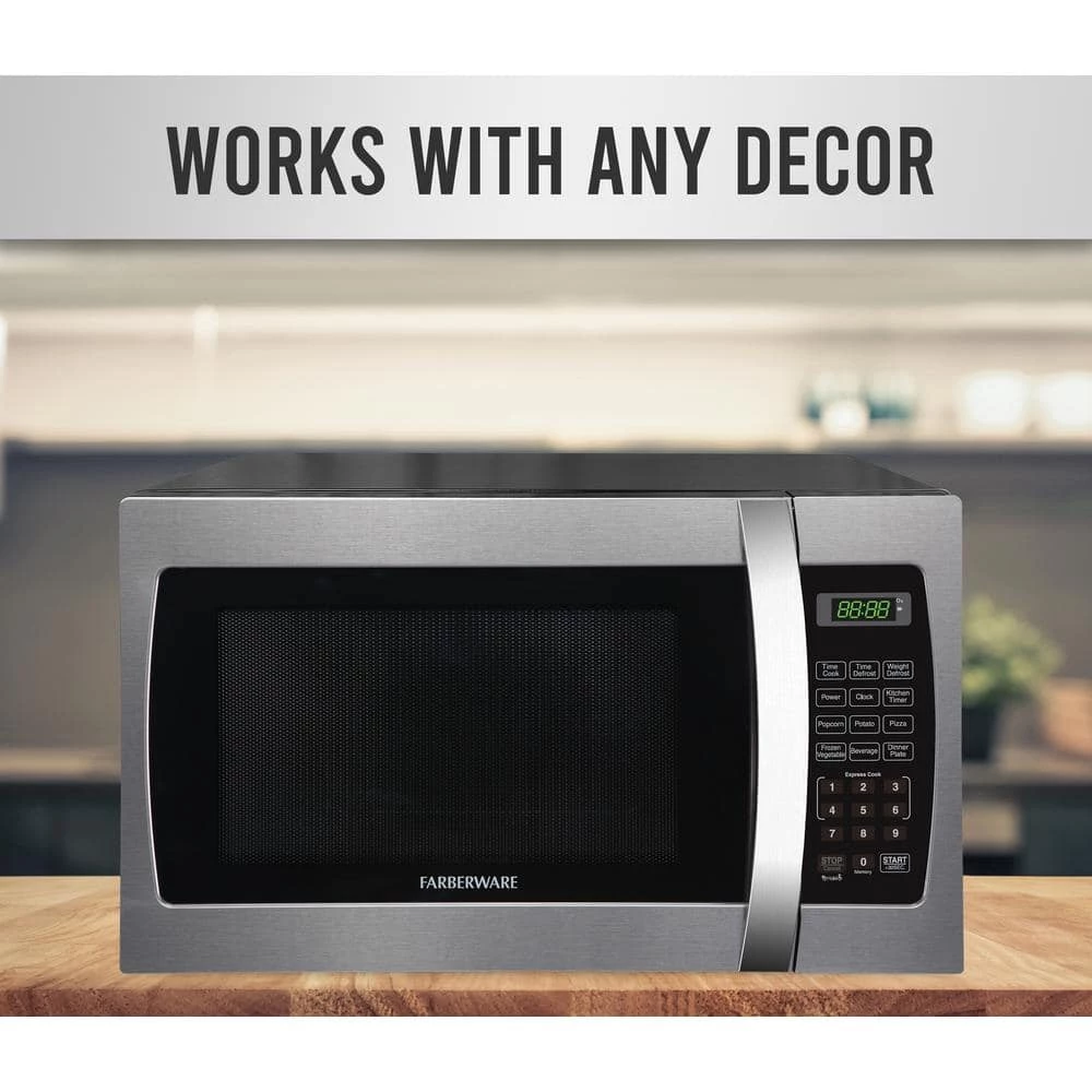 The Farberware Pro Microwave delivers power, style and convenience with a sleek, stainless steel design to compliment your kitchen. Features include 10 power levels and a Memory Function that stores and recalls your preferred cooking settings. The Farberware Pro offers an easy to operate digital interface with 1 to 6-minute express cook buttons, time or weight based defrost controls, an Add 30-Seconds control, as well as 6 pre-programmed cooking functions for popcorn, pizza, a dinner plate and more. Multi-stage cooking means that you can set the power level to adjust during the cooking cycle for perfect results without interruption. The LCD display provides a clock and kitchen timer. With a generous 1.3 cu. ft. cooking capacity, 1000-Watt of power, and a rotating turntable, the Farberware Pro is the perfect multi-tasker for your kitchen.