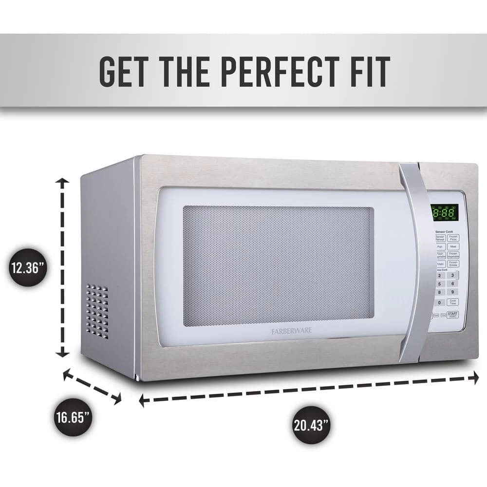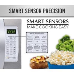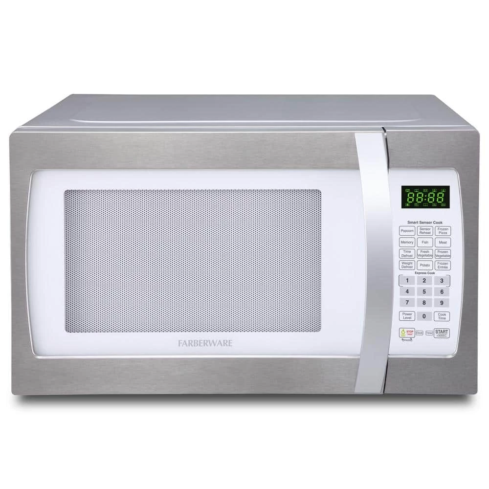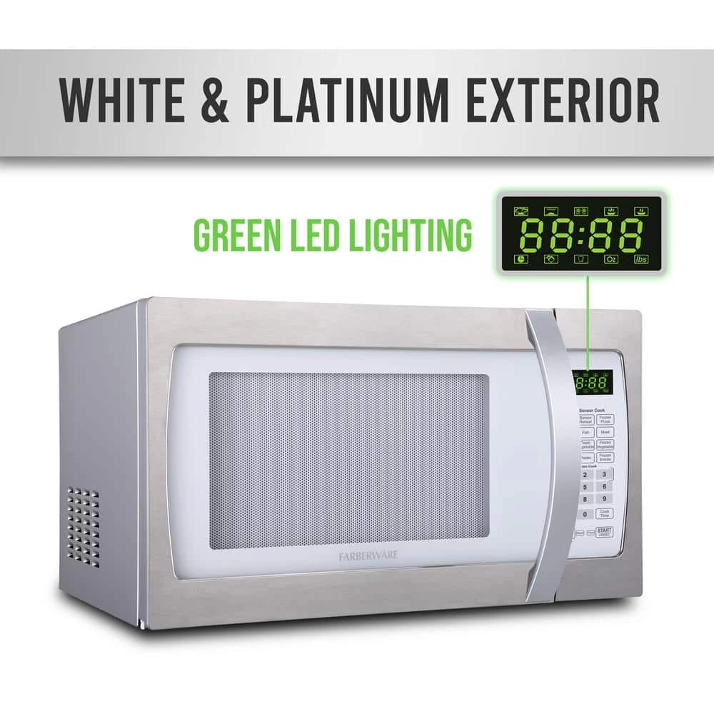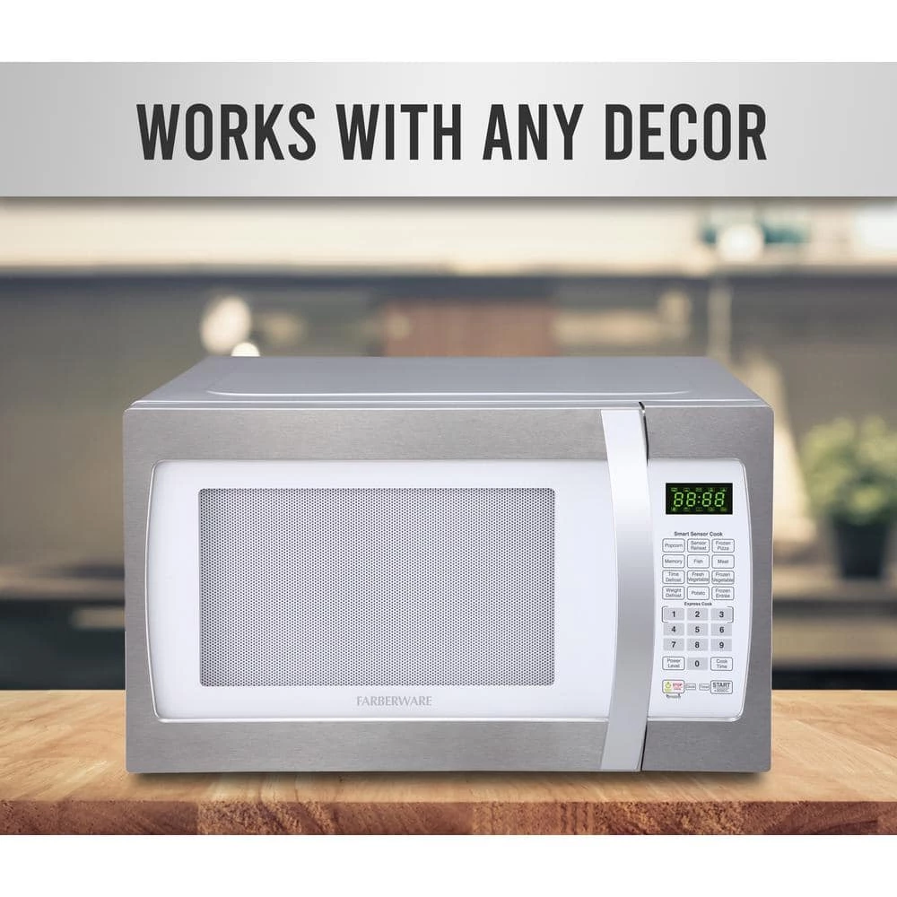 The Farberware Professional 1.3 Cubic Foot 1100 Watt Microwave Oven with Smart Sensor Cooking delivers power, style, and convenience with a sleek, Platinum design to complement your kitchen. With a 12.4-inch turntable, this models roomy interior accommodates over-sized dinner plates, perfect for a large family gathering. Smart Sensor cooking allows you to prepare preset menu items and reheat foods with precision and no guesswork. An Energy Saver power mode allows you to conserve energy when the microwave is not in active use. Features such as 1 to 3-minute instant start functions, +30-Seconds control button, 10 power control levels, 2 automatic defrost options, and Memory Function take the guesswork out of food prep. Its Multi-Stage cooking functionality adjusts cooking level mid-cycle allowing for the perfect finish. 9 One-Touch cooking programs allow for you to heat up everyday items in seconds. Additional features include a blue LED display with kitchen timer and clock as well as a child safety lock function to prevent accidental operation.