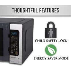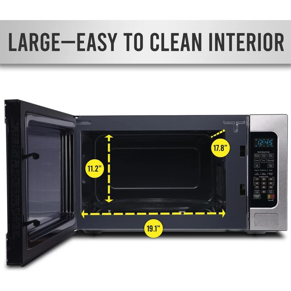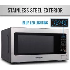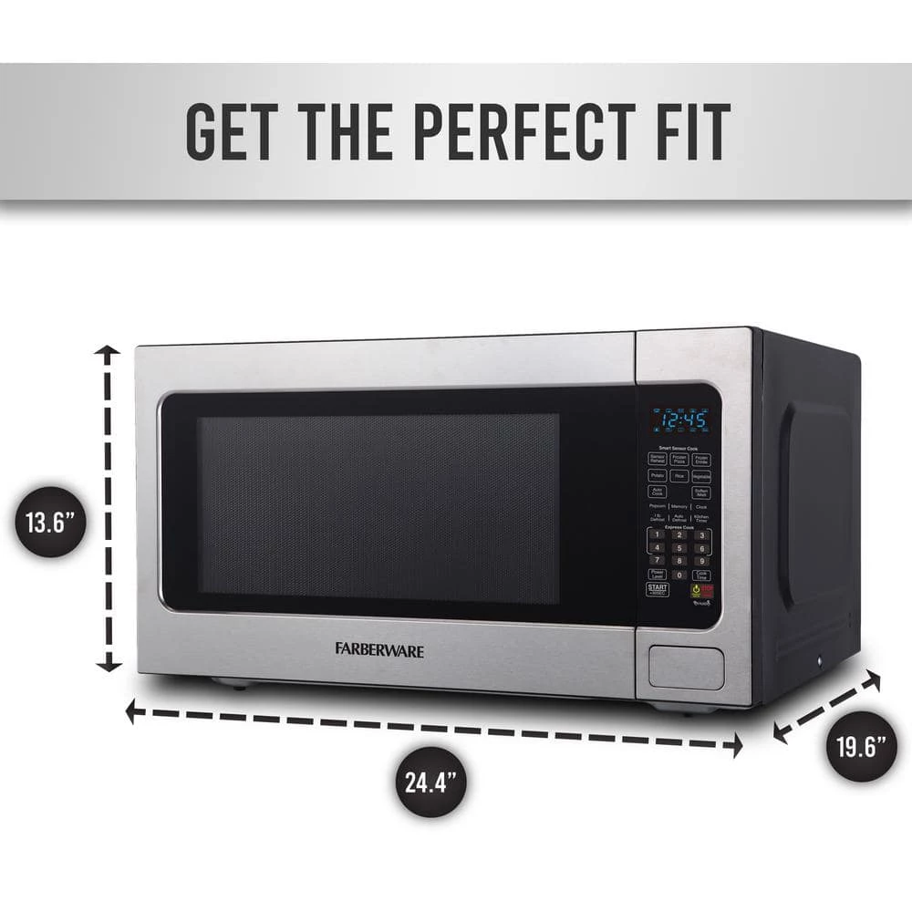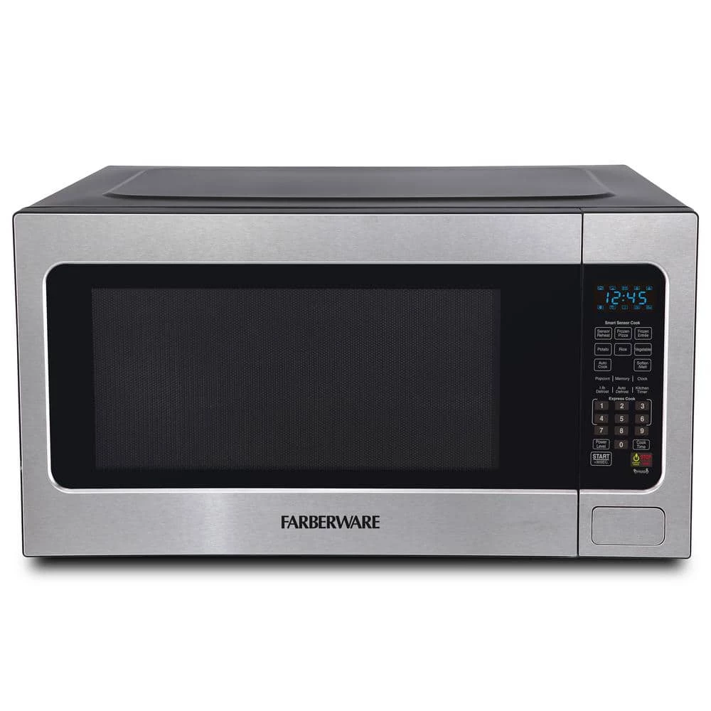 The Farberware Professional 2.2 cu. ft. 1200-Watt Microwave Oven with Smart Sensor Cooking delivers power, style, and convenience with a sleek Stainless Steel design to complement your kitchen. With a 16.5 in. turntable, this models roomy interior accommodates oversized dinner plates, perfect for a large family gathering. Smart Sensor cooking allows you to prepare preset menu items and reheat foods without overcooking using humidity sensors inside the microwave that determine when the food is ready. An Energy Saver power mode allows you to conserve energy when the microwave is not in active use. 7 One-Touch cooking programs allow you to heat up everyday items in seconds. Amenities such as 1 to 6-minute instant start functions, a +30-Seconds control button, 10 power control levels, and Memory Function take the guesswork out of food prep. 5 Auto-Cook pre-programmed settings including Bacon, Frozen Bread Reheat, Beverage, Chicken, and Oatmeal make you a versatile chef with little effort. The microwave includes 3 Automatic Defrost pre-programmed settings making defrosting your favorite item a cinch. Features such as 4 Melt pre-programmed options, and 3 Soften pre-programmed options set this microwave apart from the rest. Additional features include a blue LED display with kitchen timer and clock as well as a child safety lock function to prevent accidental operation.