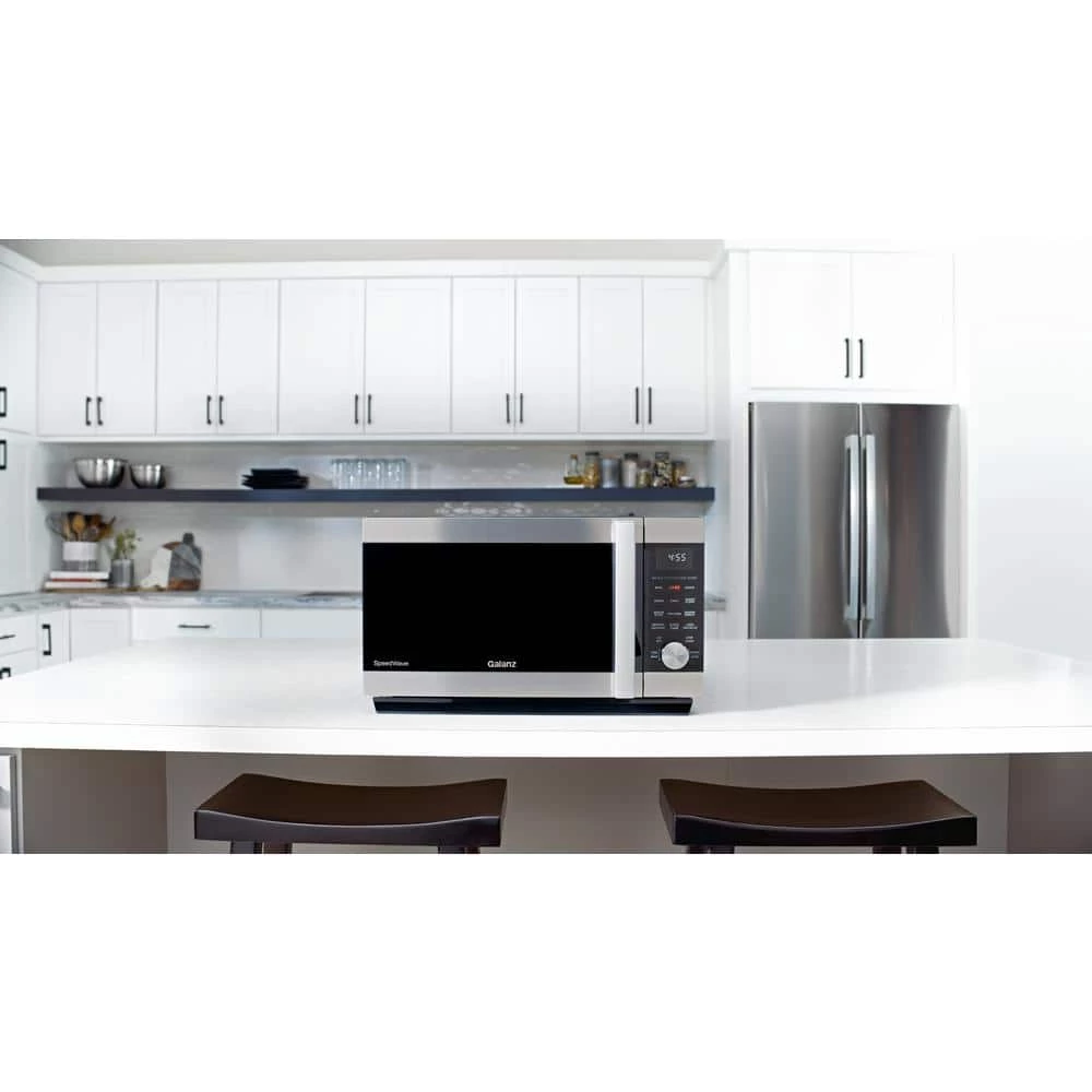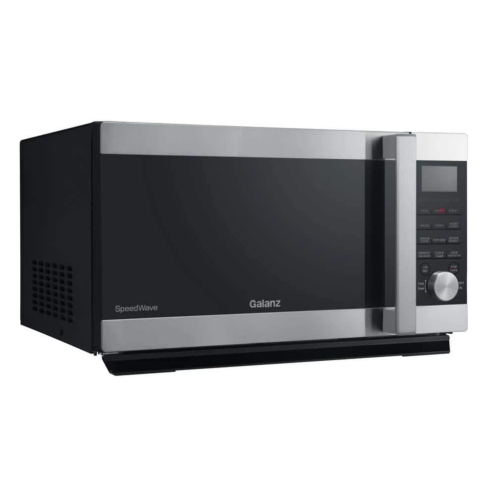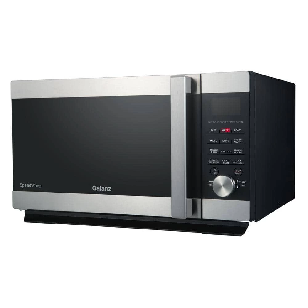 Galanz thoughtful engineering brings you SpeedWave the 3-in-1 countertop air fryer, convection oven and microwave that also includes Combi Speed Cooking option. Faster than either mode alone, the intelligent combination of True Convection and microwave cooking creates delicious dishes with optimum texture and taste. Roast chicken, baked potatoes and frozen entrees can now be ready when you are. The roomy 1.6 cu. ft. oven has plenty of room for family sized meals. TotalFry 360° technology lets you air fry with little or no oil for healthier, crunchy fried favorites like chicken, shrimp, wings, French fries even bacon. The unique easy clean air fry kit provides more frying surface area with better air circulation compared to traditional air fryers. Designed with an internal fan plus an additional heating element, SpeedWave’s True Convection technology circulates heated air throughout the oven as food spins 360°, cooking your food faster and more evenly without hot spots. Sensor Cook is equipped with a built-in humidity sensor to ensure that your food is never under- or overcooked. When your precooked dishes are hot and ready to eat, Sensor Reheat stops automatically. Thanks to Galanz thoughtful engineering, SpeedWave provides ultimate cooking versatility so you can create gourmet meals and everyday cooking.