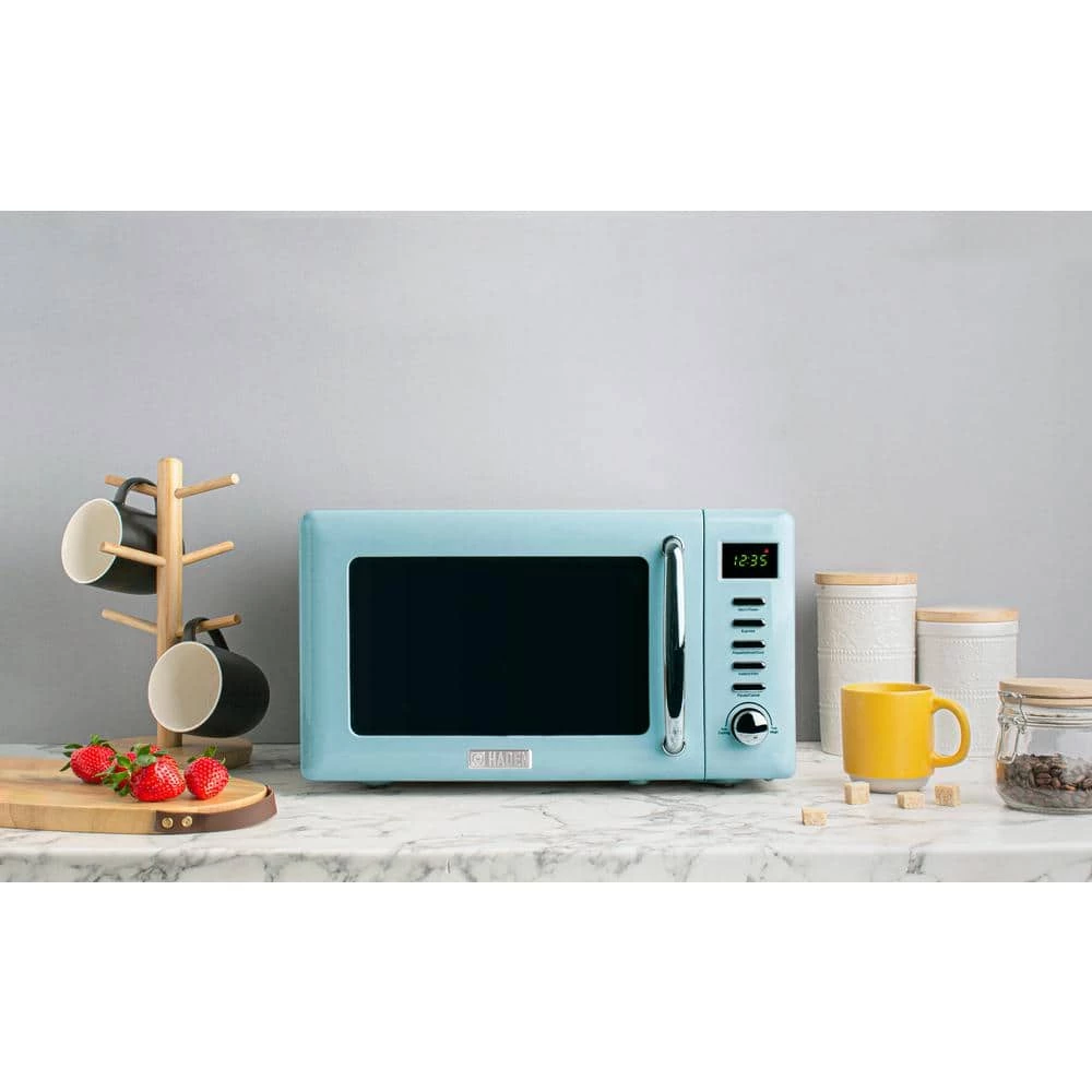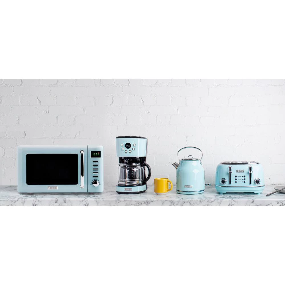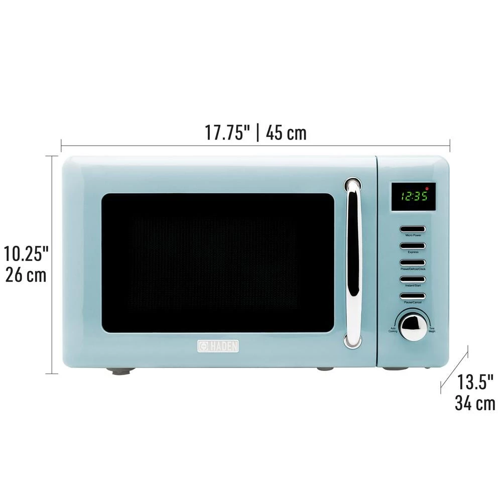 Let HADEN be the first thing on your mind as you start your day. A full line of Coffee Makers, Kettles, Toasters, and Microwaves with British design and inspiration to enhance your mornings as well as your kitchen decor. Every product is developed in depth with rigorous attention to detail, from the application of color and the visual aesthetic to how products feel to hold and use. Simple yet sophisticated, our Haden Microwave features a .7 cubic foot capacity, 700W power, convenient defrost, reheat, cooking functions, and digital controls for easy use. It’s perfect for everyday cooking, defrosting, and reheating. The sleek controls and unique, retro color make it an attractive addition to your countertop. Perfectly matches our Heritage turquoise collection.