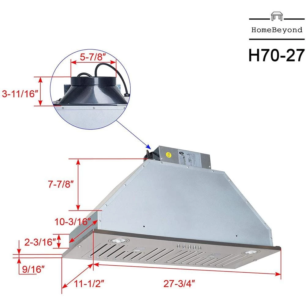 The Home Beyond 600CFM Built-In / Insert Stainless Steel Range Hood 28-inch with baffle filters is a great addition to any kitchen. The 3 speed control push button puts you in control. The contemporary design will add a touch of class to your home.