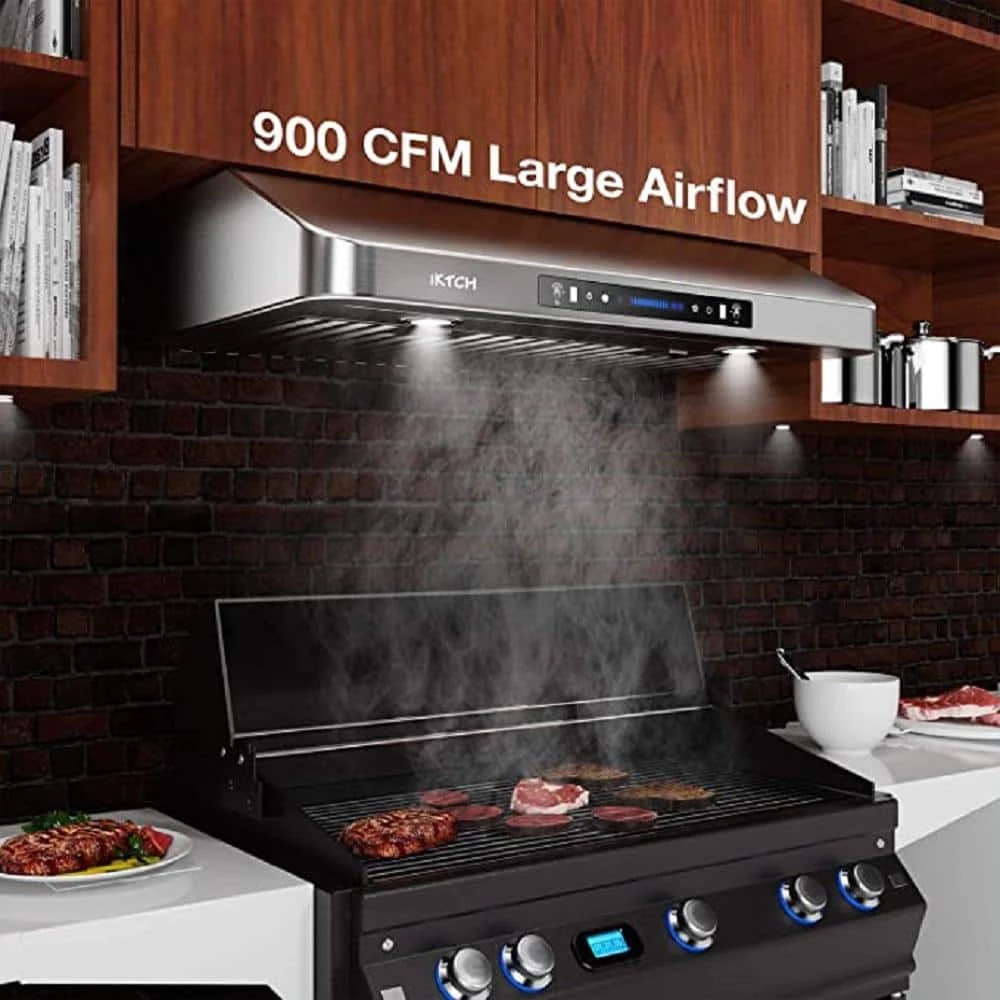 - 900 CFM range hood with dual motors and balancing fan; it can easily remove large amounts of smoke and cooking odor from the kitchen air; the exhaust system is designed for heavy-duty cooking