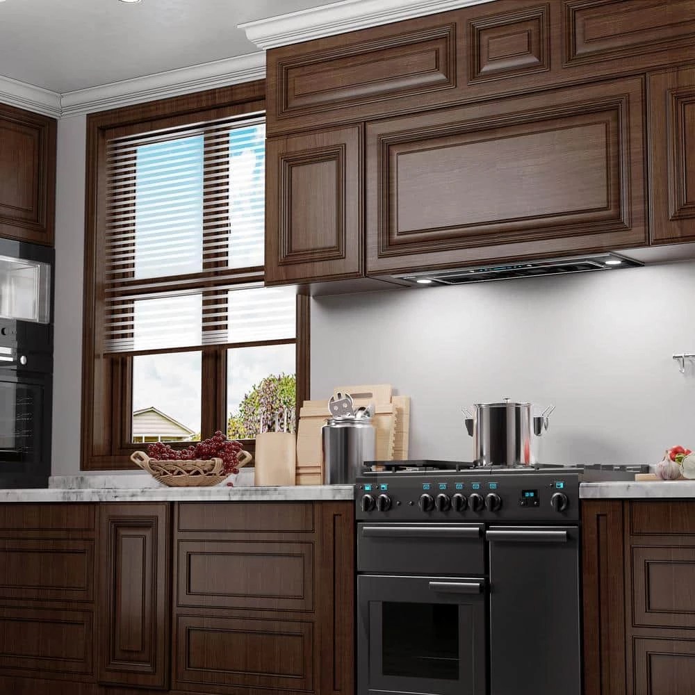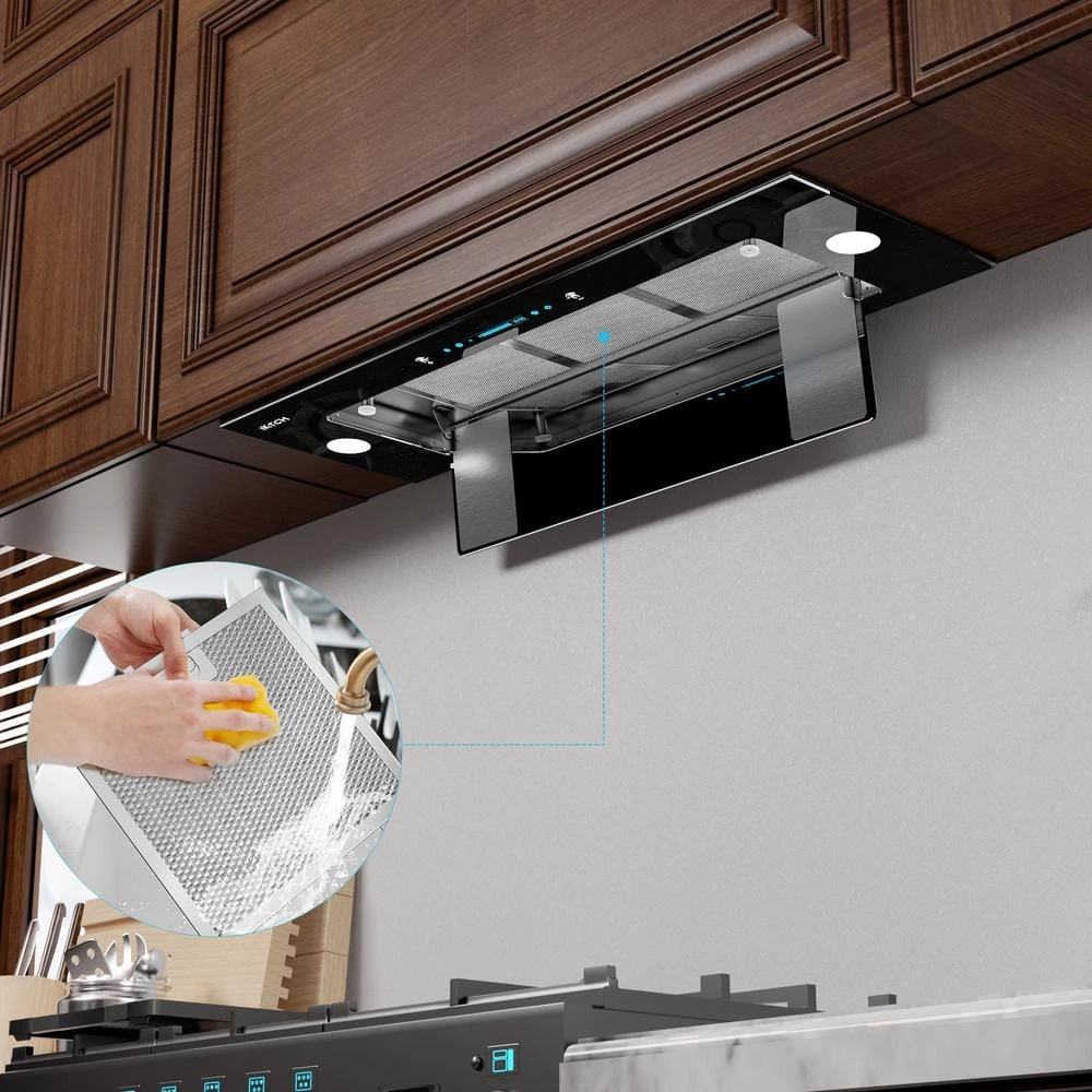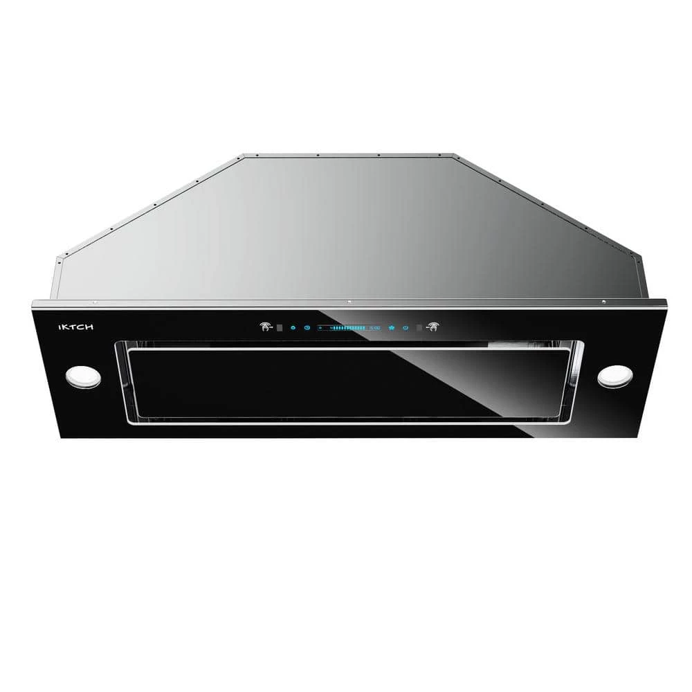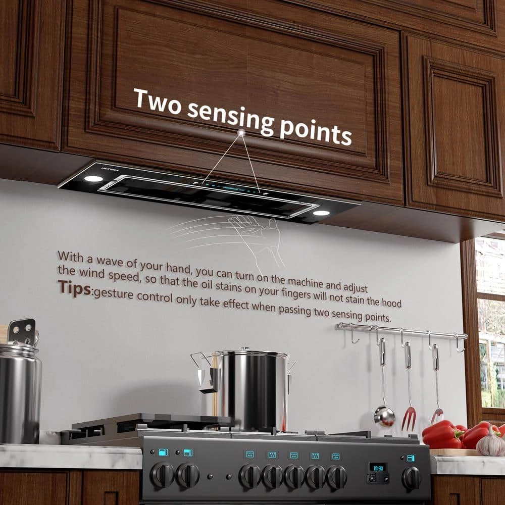 This sleek design range hood with meticulous workmanship brings a premium feel of cooking, black tempered glass panel and stainless steel, it gives you a beautiful and impressive high-end kitchen. Gesture sensing control technology. If your hands get greasy with cooking, just sweep one hand across 2 sensing spots to control fan speeds without touching the range hood.