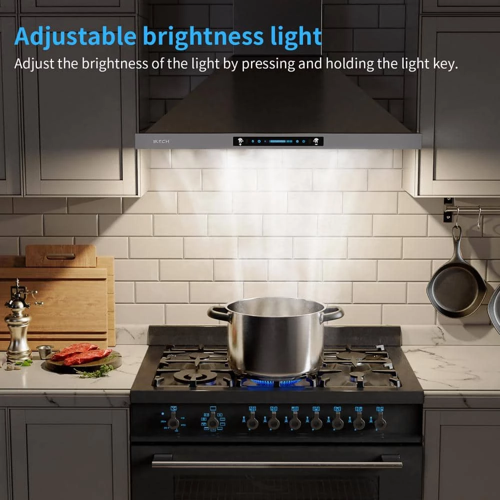 Professional wall mount stainless steel range hood with a modern design and built to last quality. 900 CFM 4-speed motor will provide all the power you need to quietly and efficiently ventilate your stove while cooking. 3-Watt LED lamps evenly illuminate your cooking area and presenting the original color of the food. Smart gesture control, when our hands are not convenient to touch the range hood, we can use the gesture control function. Add a modern look to your kitchen with this slick low profile stainless steel professional range hood while it works efficiently getting rid of greasy smoke and odors.