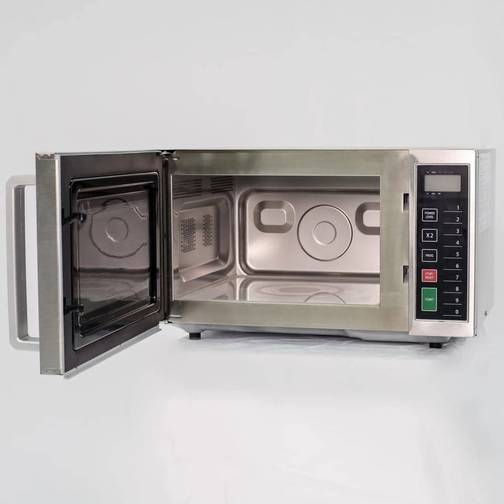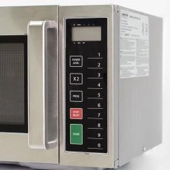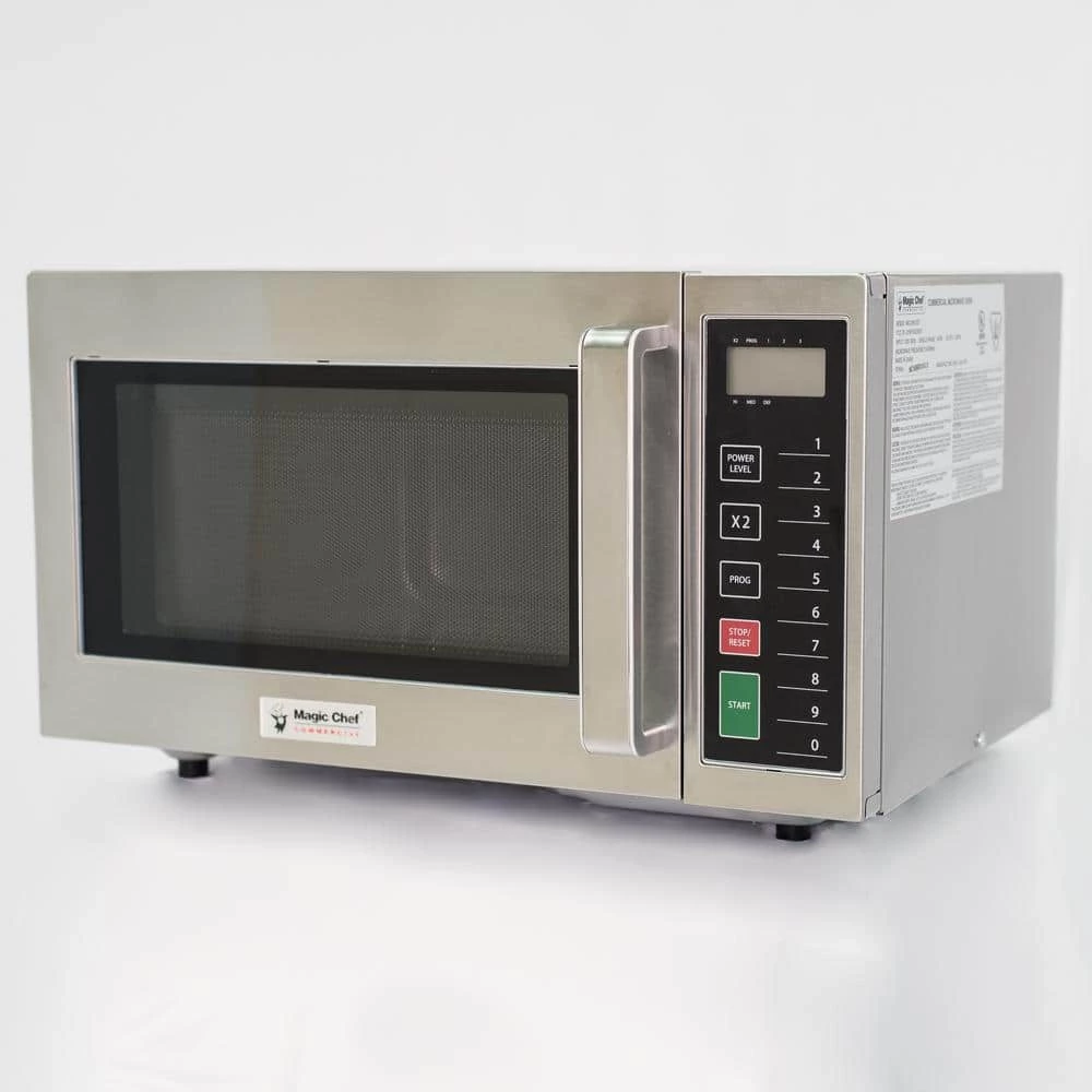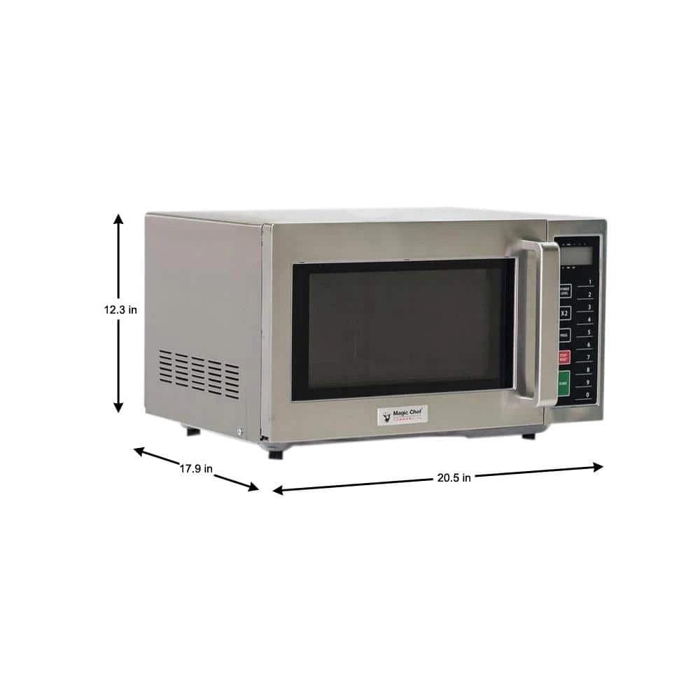 The Magic Chef commercial microwave oven offers high performance at 1000-Watt. You may program up to three multiple cooking stages. The microwave also allows for saving frequently used cooking programs to a number key and easily activating by touching that number key and start pad. The 0.9 cu. ft. capacity microwave’s exterior is stainless steel and also features a door safety lock system.