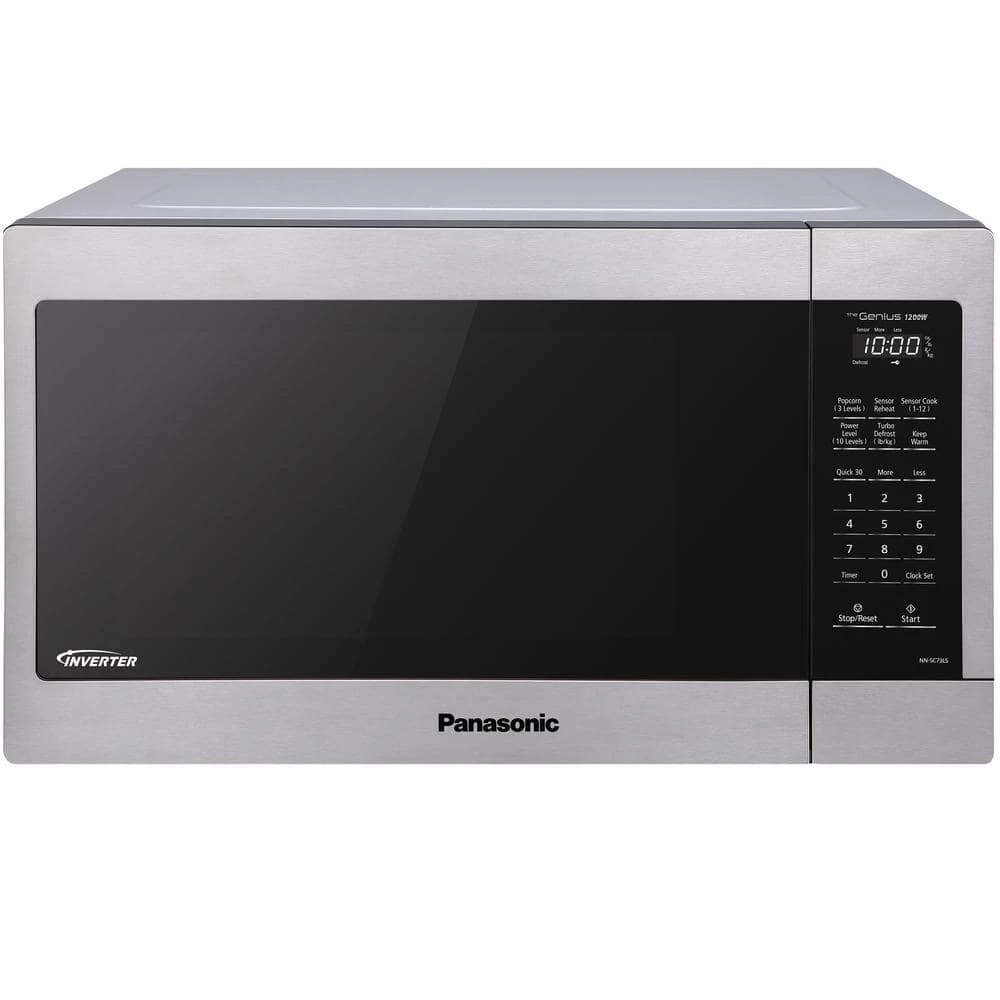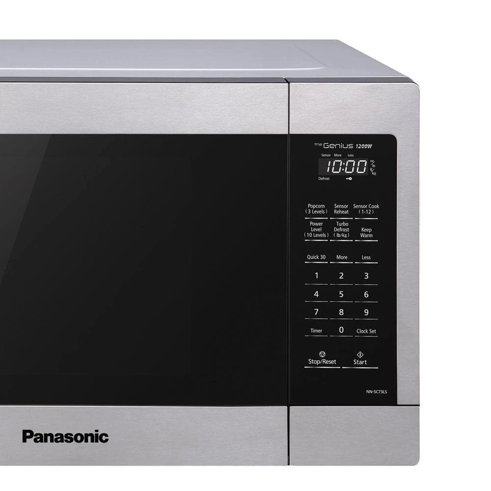 The Panasonic NN-SC73LS microwave with Inverter Technology uses 1200-Watt of cooking power to cook, defrost, reheat and more. Unique Inverter Technology which, unlike traditional microwaves that rely on pulse-on, pulse-off power at lower temperatures, delivers a constant stream of cooking power at every temperature for more evenly cooked meals – edges to centers – every time. With the touch of the Genius Sensor cooking button, this microwave takes guesswork out of creating a great meal by automatically setting power levels and adjusting cooking or defrosting time for added time-saving convenience. The sensor measures the amount of steam produced during cooking and signals the microprocessor to calculate the remaining cooking time at the appropriate power level. A selection of 10-auto cook options enable you to quickly prepare your favorite foods, such as pizza, pasta, soup, casserole and other dishes, plus enjoy a dedicated popcorn button, keep warm function and more. Spacious 1.6 cu. ft. interior includes 13.6 in. glass turntable and fits a large baking dish. The stainless steel exterior design can rest on any open surface in the kitchen and can be easily moved.