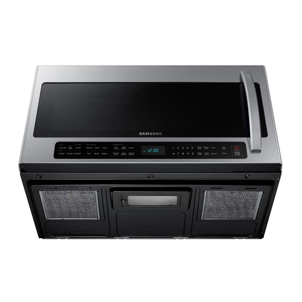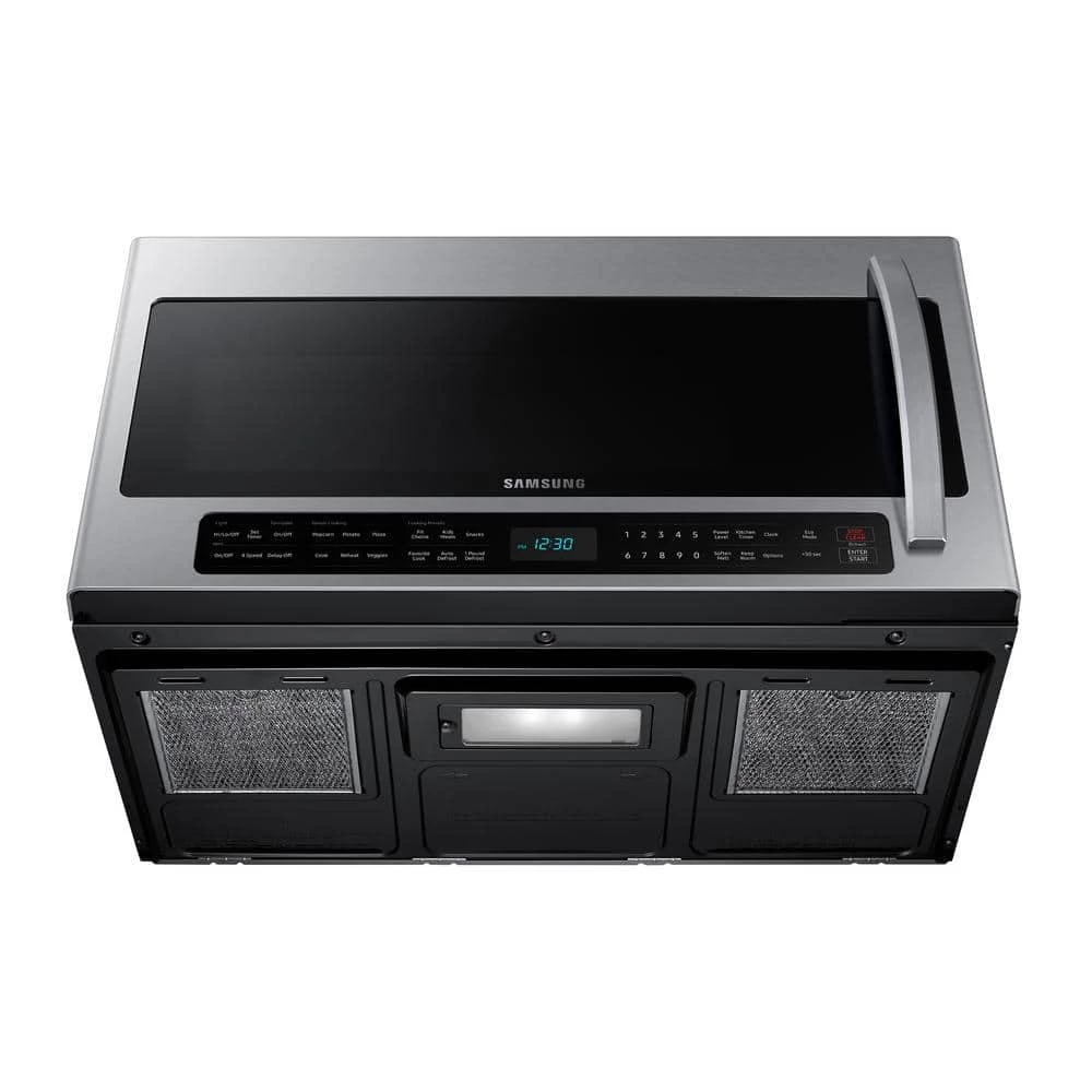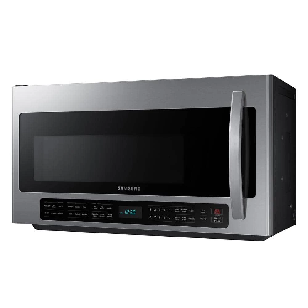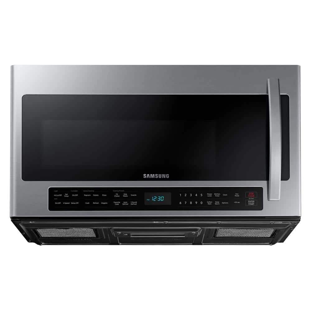 Samsung 2.1 cu. ft. extra large capacity Over-the-Range Microwave makes preparing multiple dishes effortless by accommodating even your biggest dishes. Sensor Cook technology automatically adjusts your cooking time for optimal results. Additionally, the Ceramic Enamel Interior provides a durable, scratch resistant and easy to clean interior, making everyday maintenance simple.