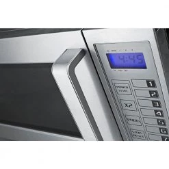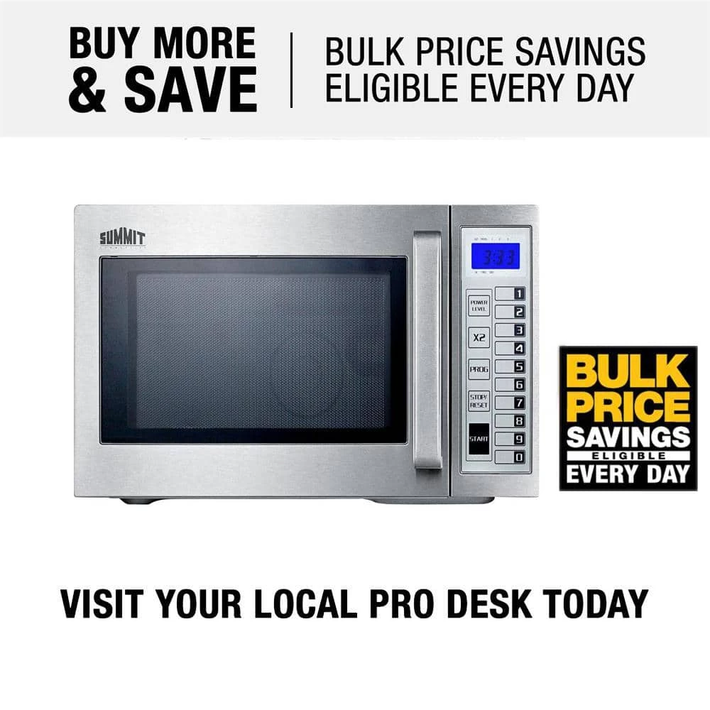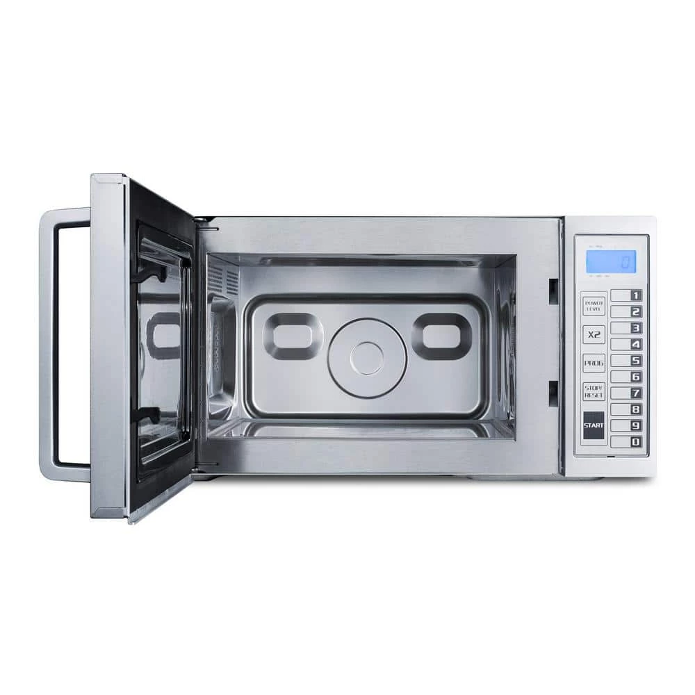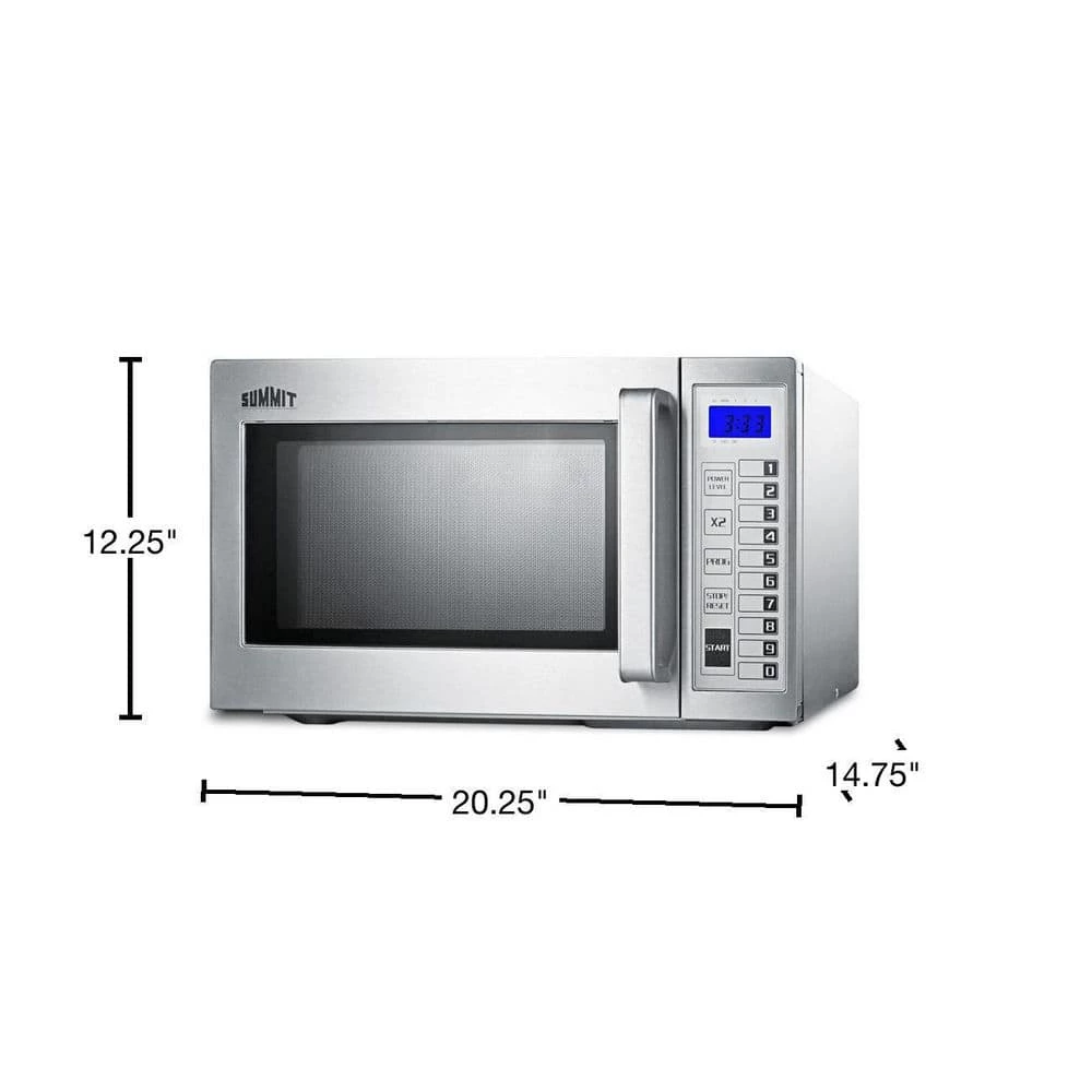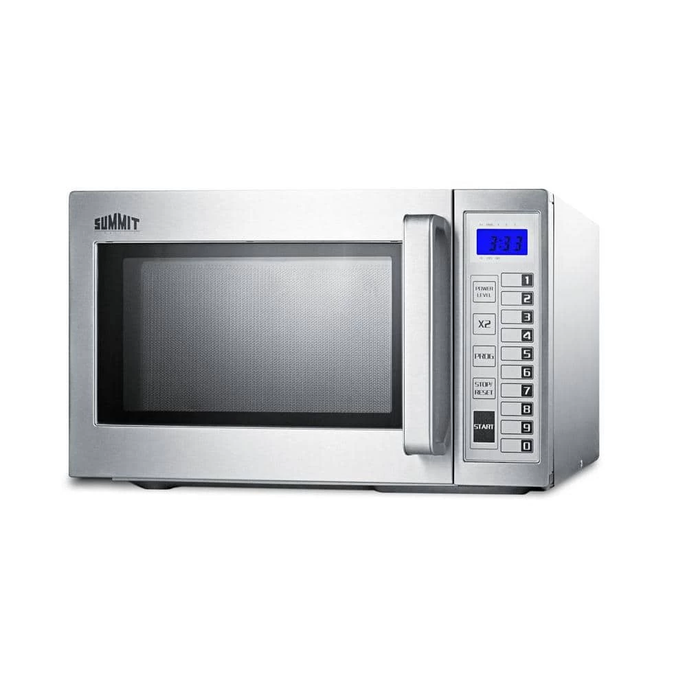 Summit commercial offers durable small cooking solutions built to meet rigid NSF standards. Model SCM1000SS1 is a commercially approved countertop microwave in complete stainless steel. This 1000-Watt unit is ideal for use in foodservice establishments with a professional look in brushed stainless steel and an easy-grip handle. The interior features a flat bottom with no turntable, offering more space and a stronger construction with one less part. Digital controls offer multiple power levels for proper cooking. Cooking programs can also be saved for easy 1-touch use. This model also includes a programmable child lock and function to count how many times the oven has been used.