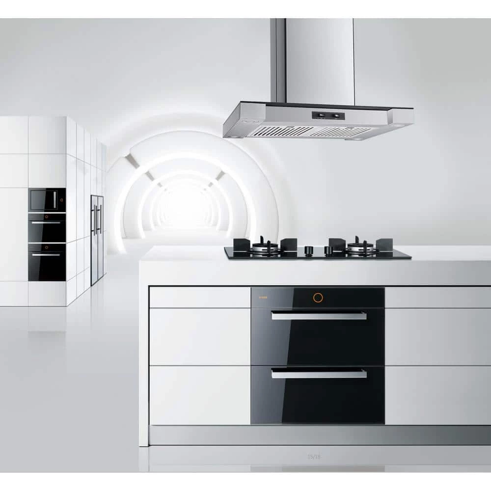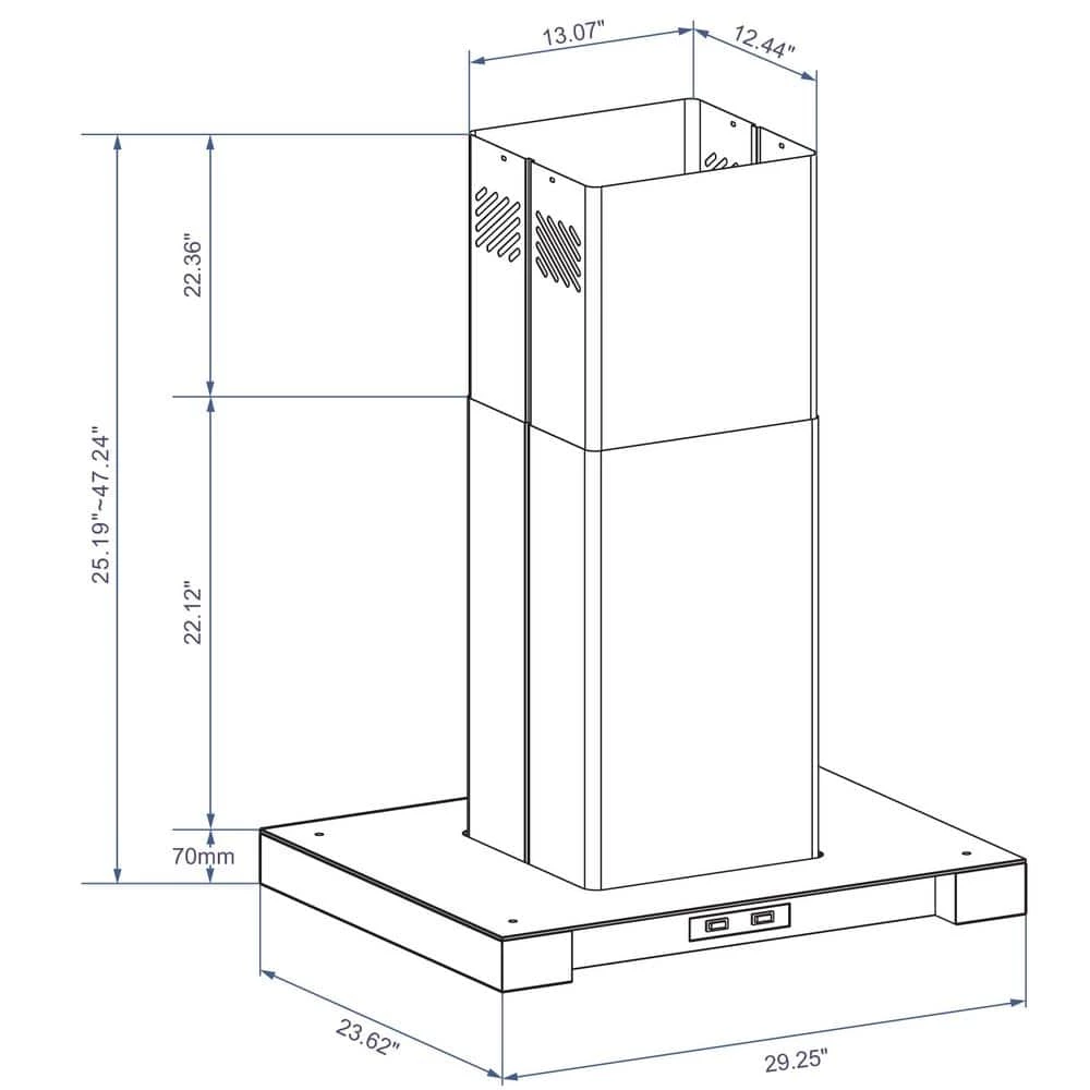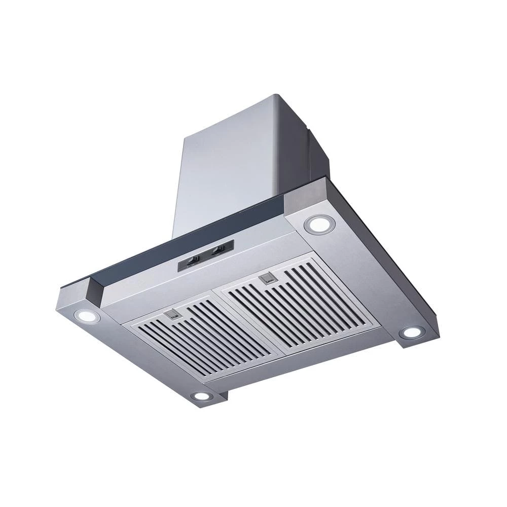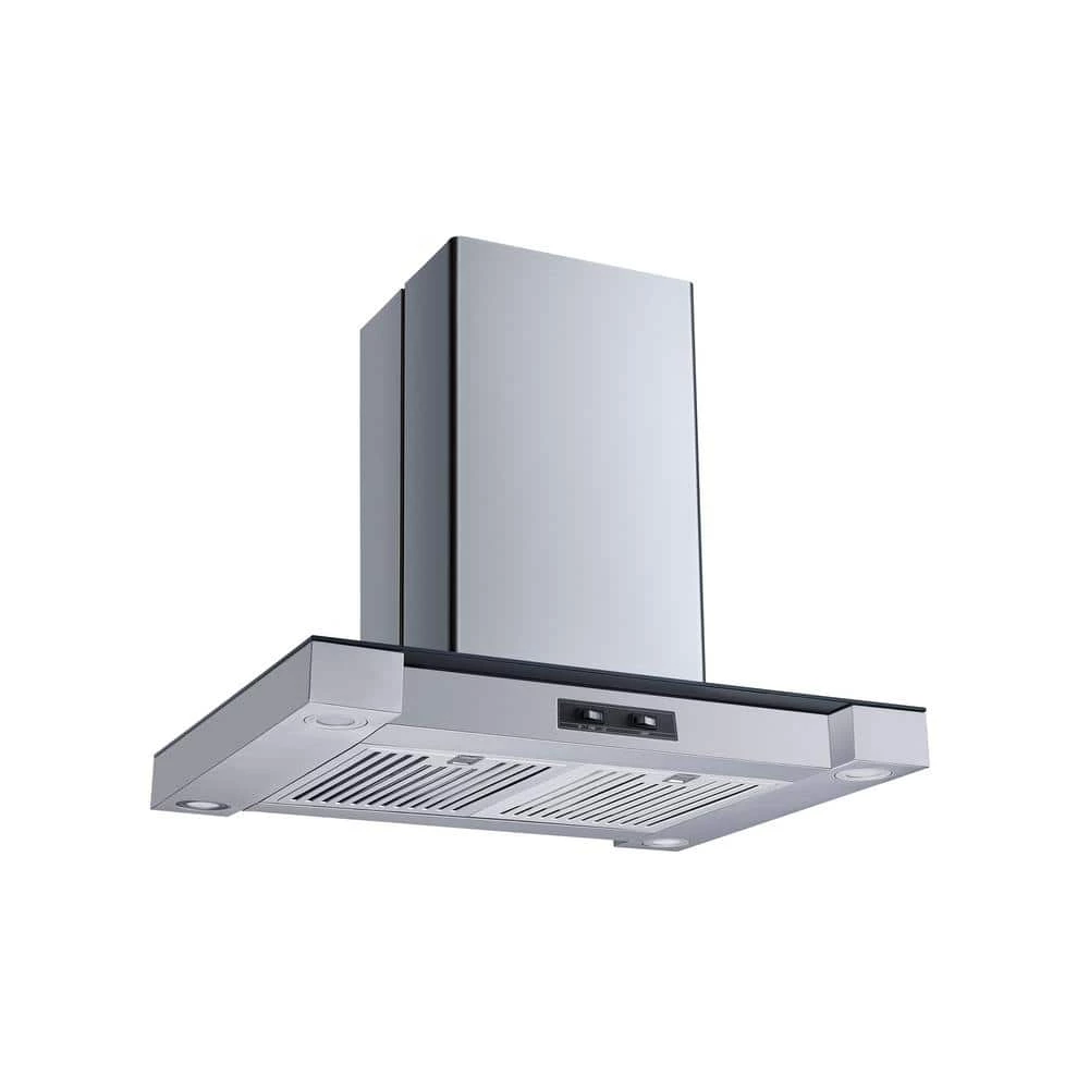 This beautiful island mounted range hood will create splendor and elegance in your kitchen. Constructed of high quality 430 stainless steel and clear tempered glass. Complete with easy removable stainless steel baffle filters that remove smoke and grease from your cooking area and are dishwasher safe. This model also comes with 4-bright energy saver soft white LED lights, low noise level operation, 286 CFM airflow, easy to operate rocker control for high and low fan level and lights. This range hood comes with all the parts you need for easy installation. Adjustable and telescoping chimney can fit 8 to 9 ft. ceiling. This unit is convertible, can be vented out of your dwelling or recirculating (ductless) with charcoal filters (sold separately, part# WRHF005S2).