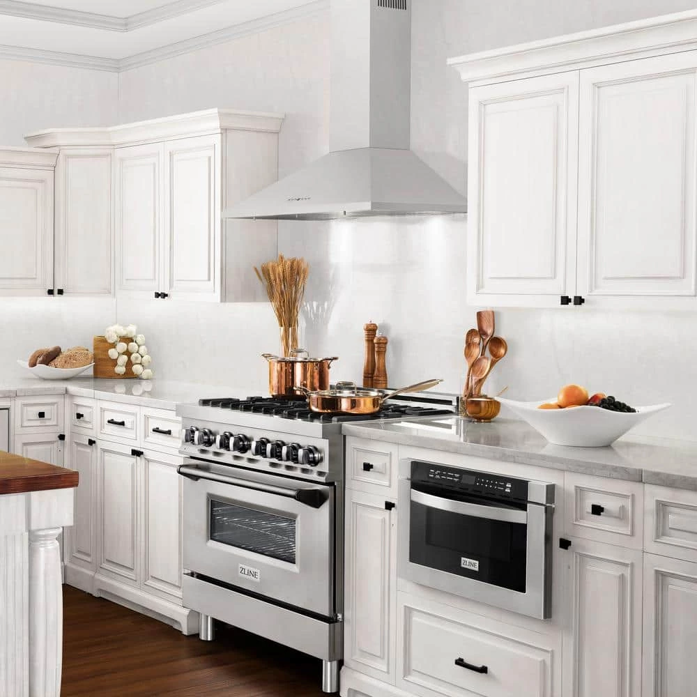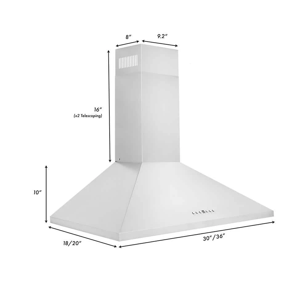 The ZLINE KL2-30 is a 30 in. professional wall mount stainless steel range hood with a modern design and built-to-last quality, making it a great addition to any kitchen. This hood’s high-performance, 400 CFM 4-speed motor will provide all the power you need to quietly and efficiently ventilate your stove while cooking. With its classic 430 grade stainless steel, this range hood contains rust, temperature, and corrosion-resistant properties to ensure a durable vent hood that will last for years to come. Enjoy modern features, including built-in LED lighting for an illuminated culinary experience and dishwasher-safe stainless steel baffle filters for easy clean-up. This wall mount range hood has a convertible vent, so you can have a luxury range hood whether you need a ducted or ductless option. Enjoy easy installation and an easy recirculating conversion process. Experience Attainable Luxury in the heart of your home, with a ZLINE range hood. ZLINE Kitchen and Bath stands by all products with its manufacturer parts warranty. The KL2-30 ships next business day when in stock.