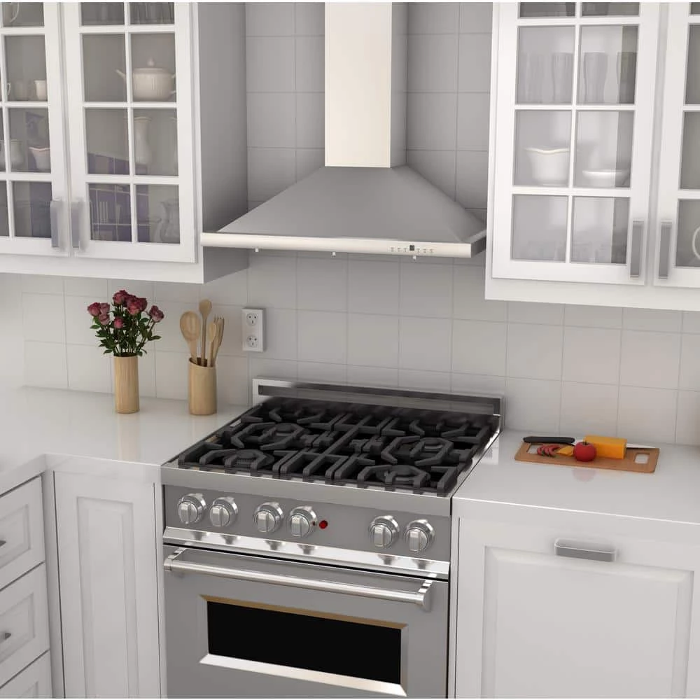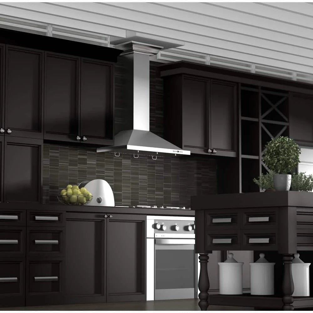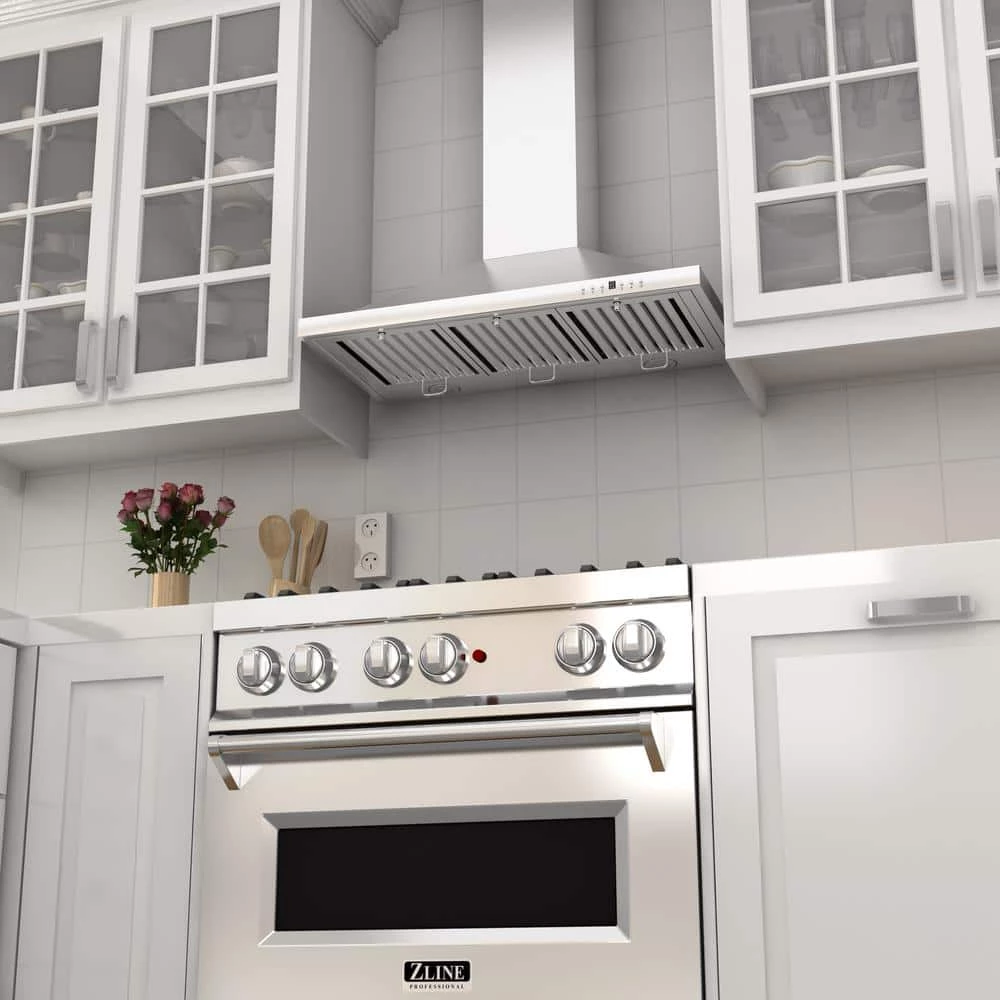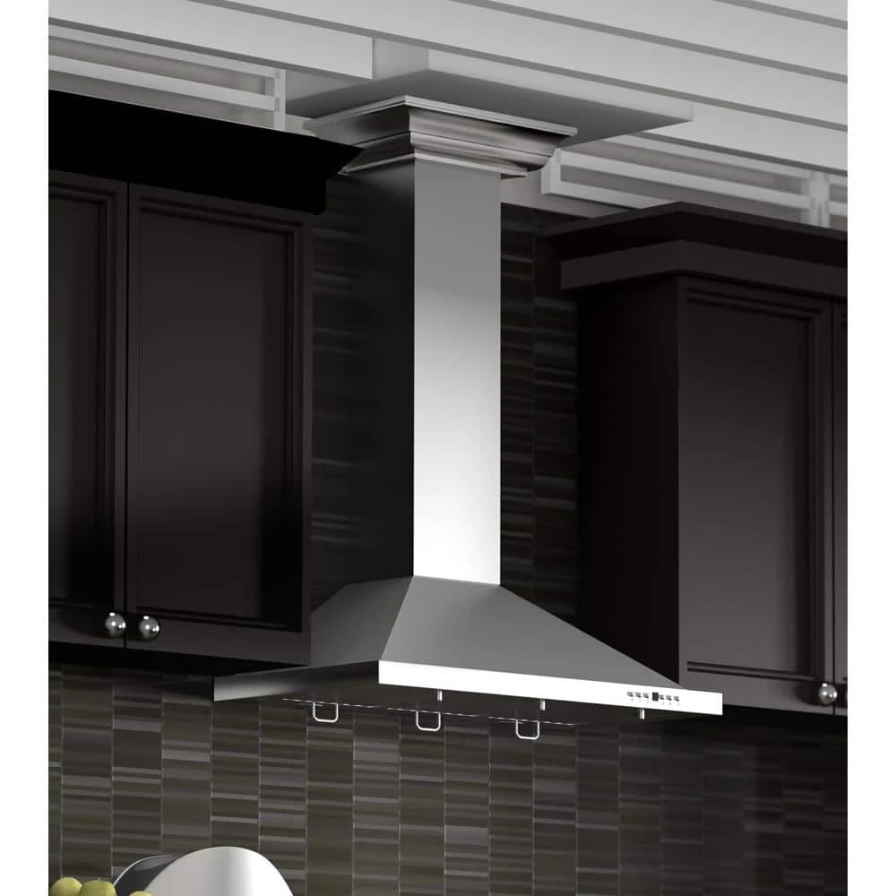 The ZLINE KBCRN-30 is a 30 in. professional wall mount stainless steel range hood with a modern design and built-to-last quality, making it a great addition to any kitchen. This hood’s high-performance, 400 CFM 4-speed motor will provide all the power you need to quietly and efficiently ventilate your stove while cooking. With its classic 430 grade stainless steel, this range hood contains rust, temperature, and corrosion-resistant properties to ensure a durable vent hood that will last for years to come. Enjoy modern features, including built-in LED lighting for an illuminated culinary experience and dishwasher-safe stainless steel baffle filters for easy clean-up. This wall mount range hood has a convertible vent, so you can have a luxury range hood whether you need a ducted or ductless option. Enjoy easy installation and an easy recirculating conversion process. Experience Attainable Luxury in the heart of your home, with a ZLINE range hood. ZLINE Kitchen and Bath stands by all products with its manufacturer parts warranty. The KBCRN-30 ships next business day when in stock.
